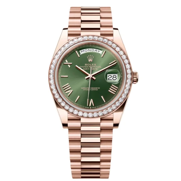 Rolex “President” 40mm Everose Gold Olive Green Roman Dial Diamond Bezel – 228345RBR