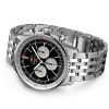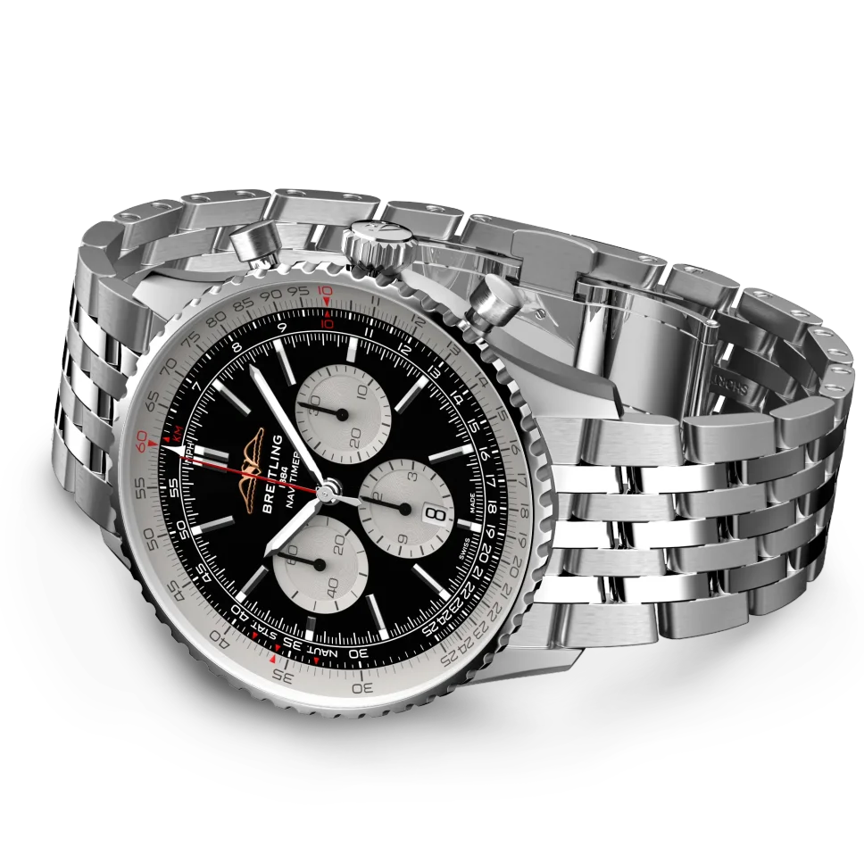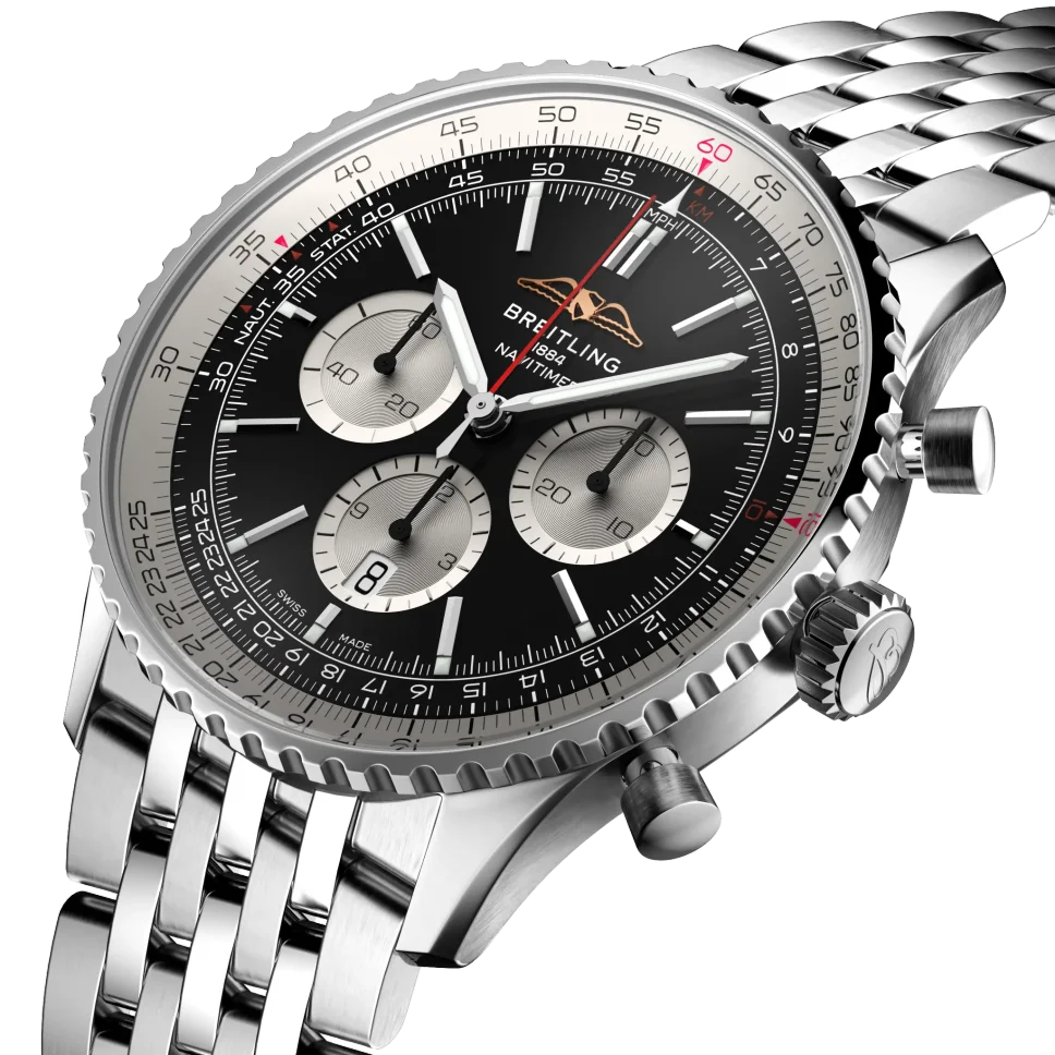 Enhancing the original features of Navitimers from seventy years ago, this model features a black dial with baton indexes, a trio of chronograph counters, and a notched bezel for easy grip.