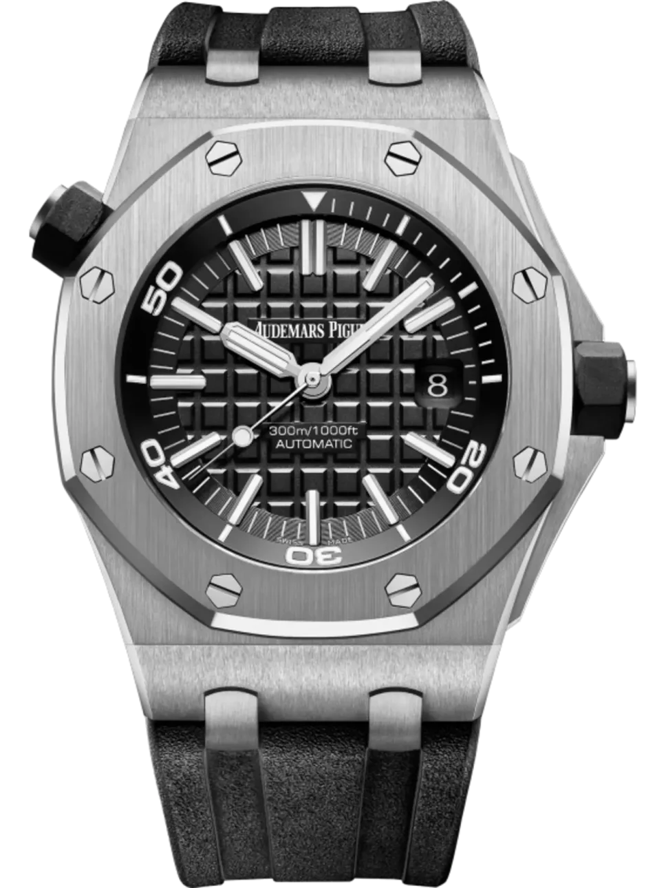 Black dial with “Méga Tapisserie” pattern, white gold applied hour-markers and Royal Oak hands with luminescent coating (black minutes hand), black or silver-toned rotating inner bezel with diving scale and zone from 60 to 15 minutes in black.