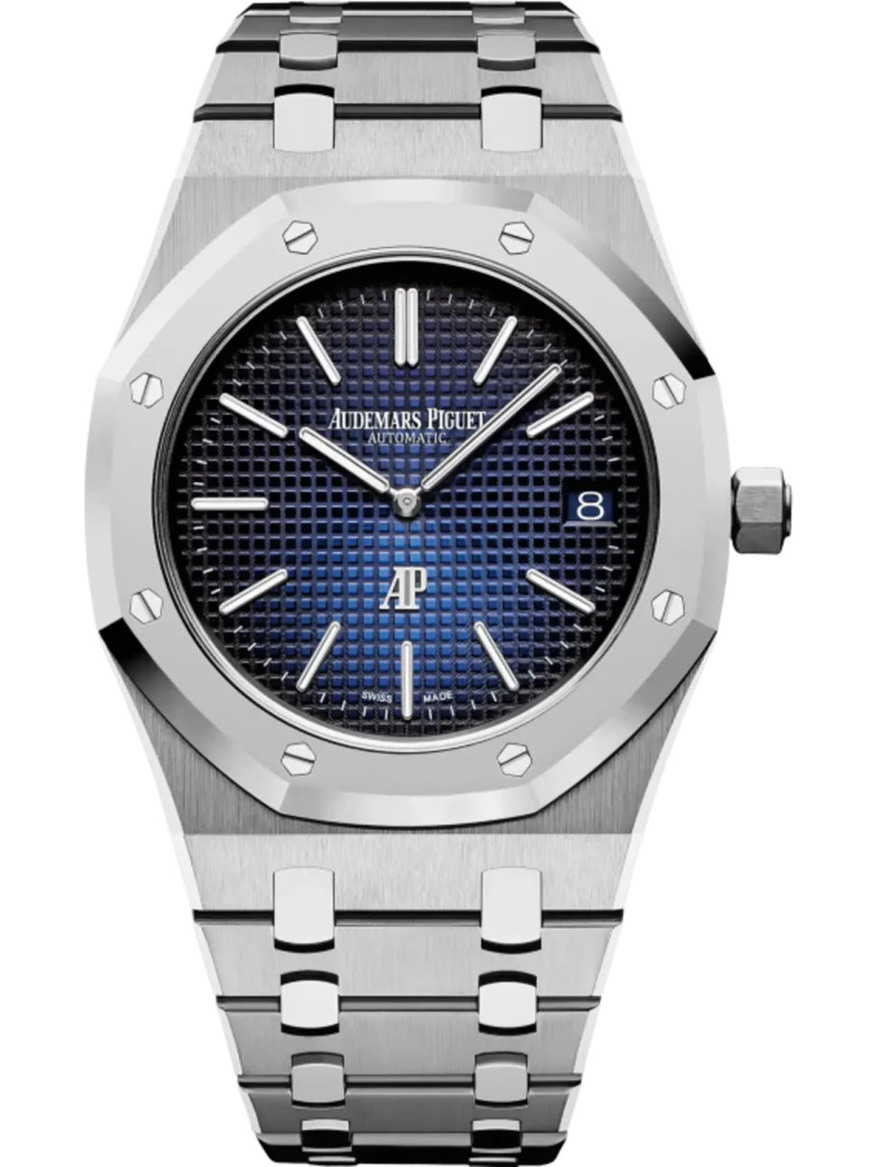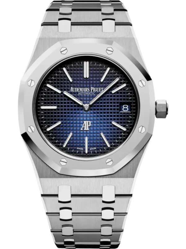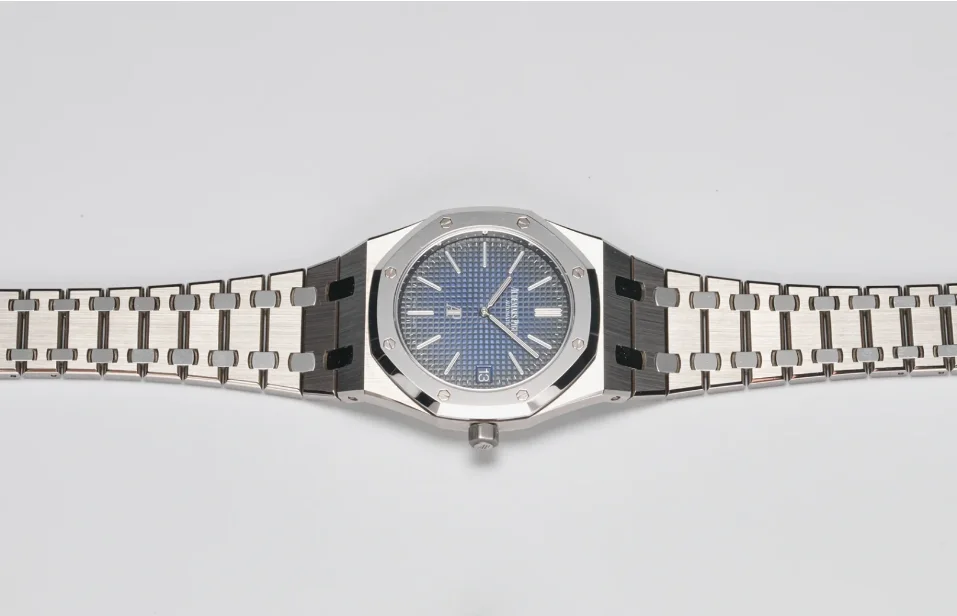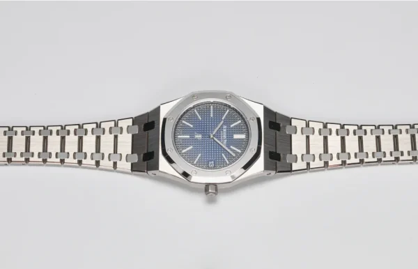 Smoked blue dial with “Petite Tapisserie” pattern, white gold applied hour-markers and Royal Oak hands with luminescent coating.