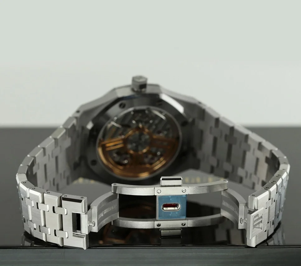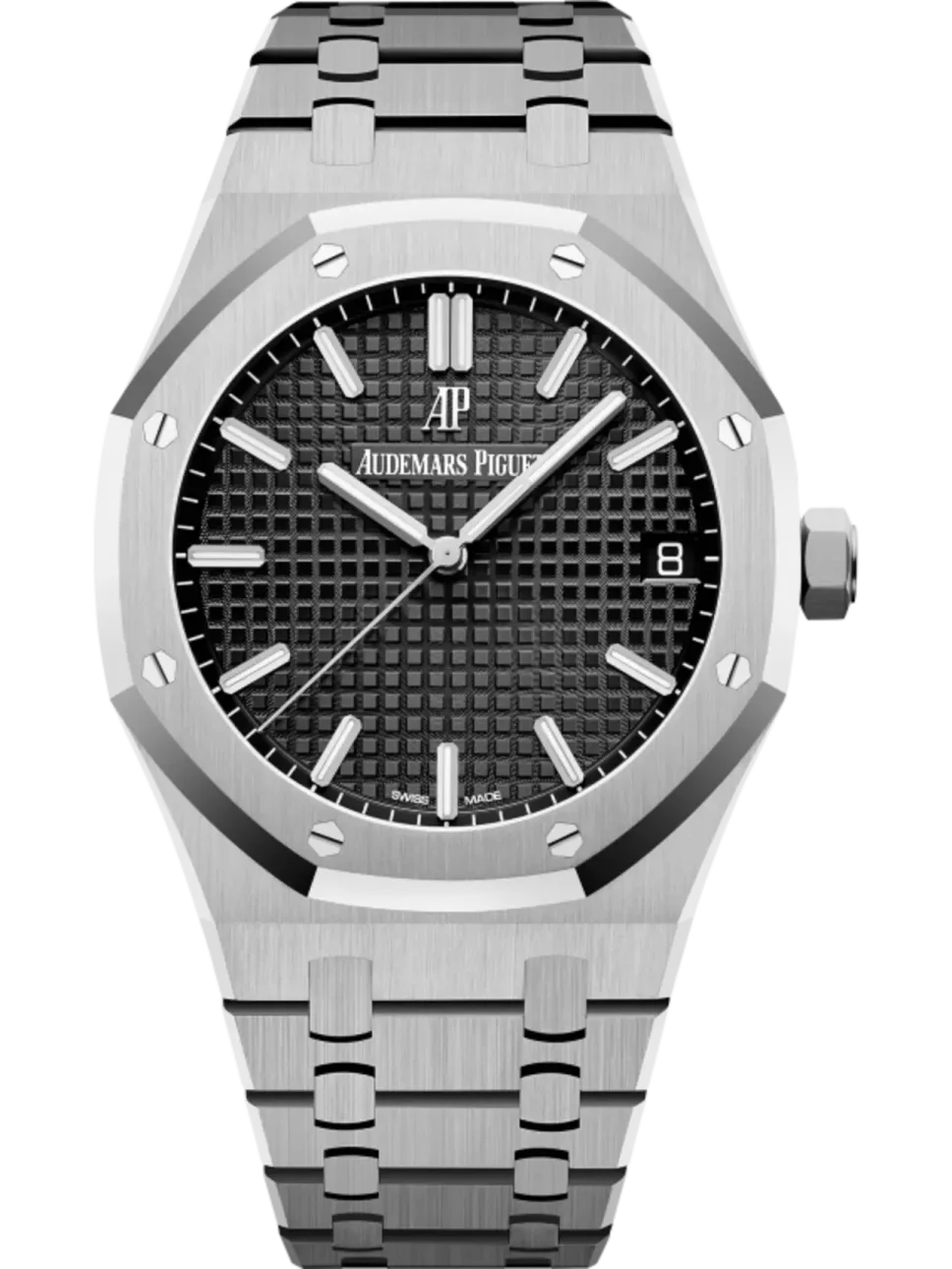 Black dial with “Grande Tapisserie” pattern, white gold applied hour-markers and Royal Oak hands with luminescent coating.