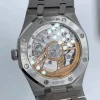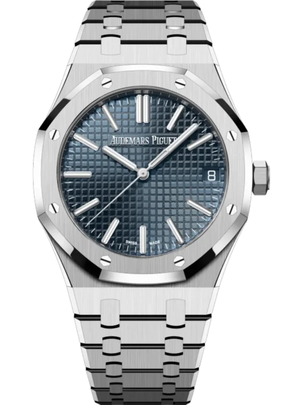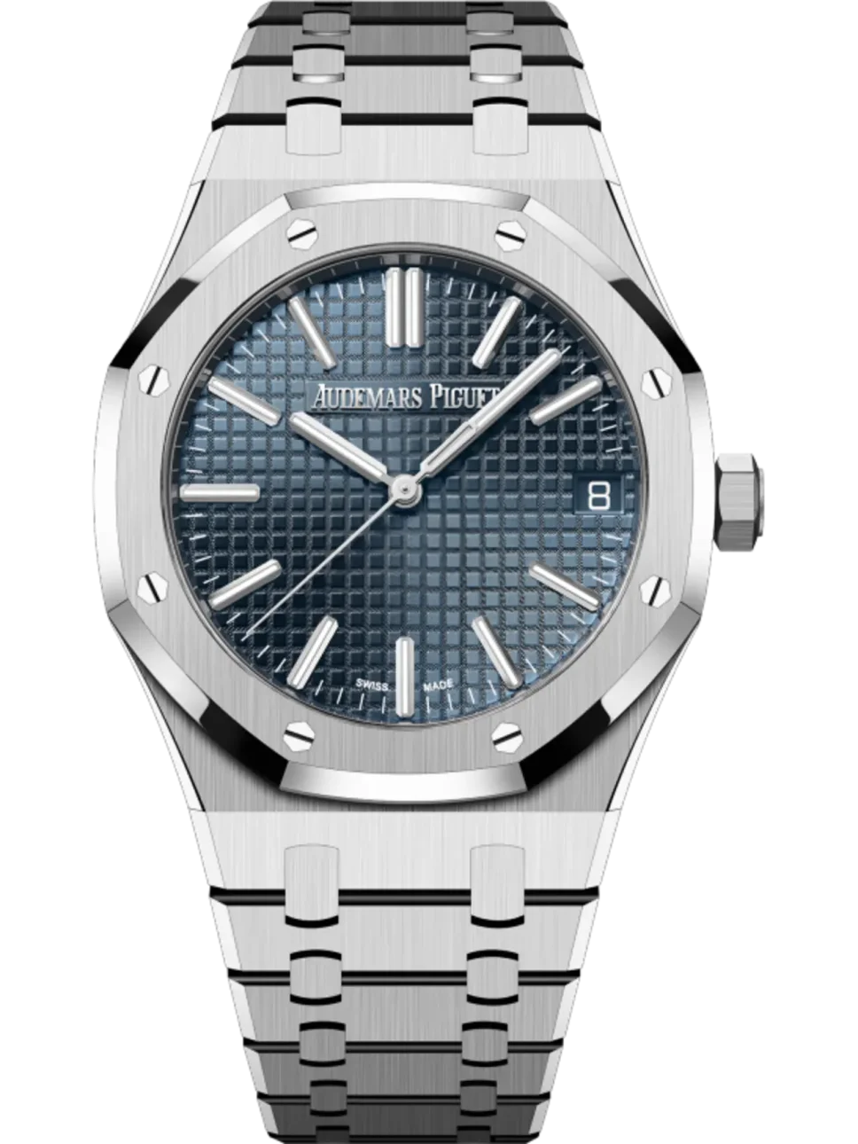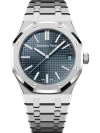 “Bleu nuit nuage 50” dial with “Grande Tapisserie” pattern, white gold applied hour-markers and Royal Oak hands with luminescent coating.