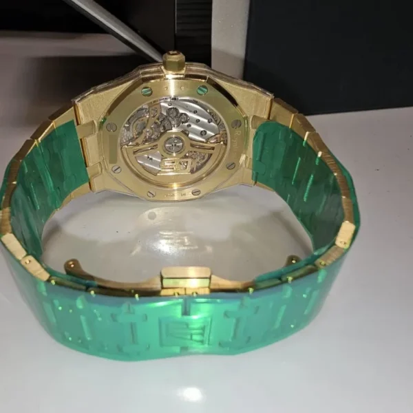 Smoked yellow gold-toned dial with “Petite Tapisserie” pattern, yellow gold applied hour-markers and Royal Oak hands with luminescent coating.