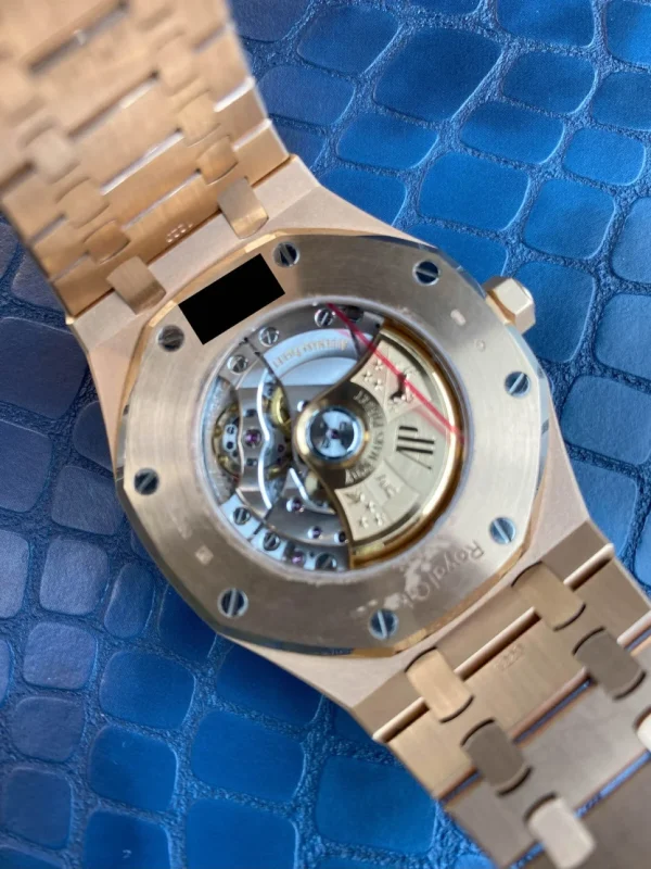 Dial | Blue dial with “Grande Tapisserie” pattern, rose gold applied hour-markers and Royal Oak hands with luminescent coating |