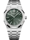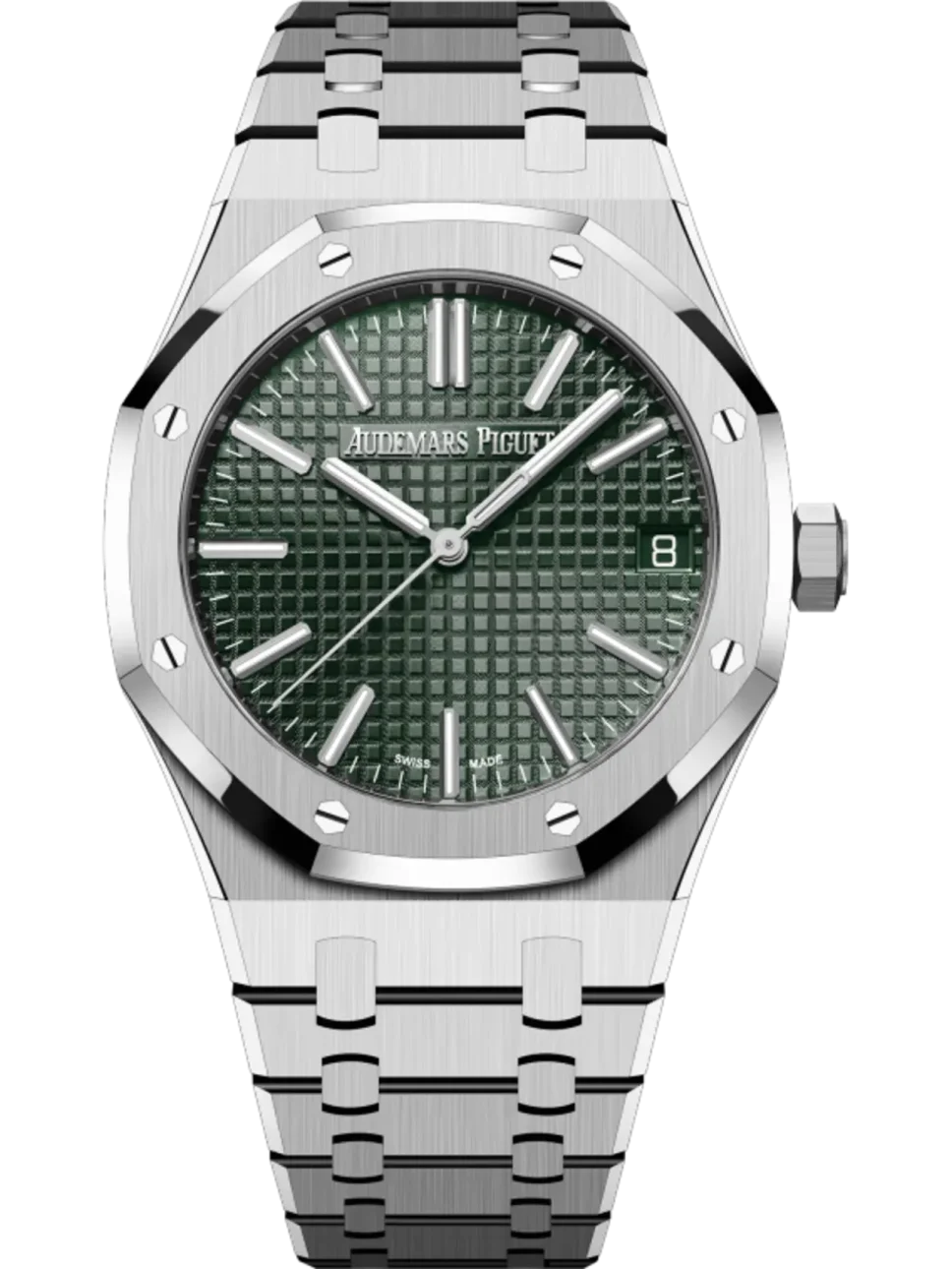 Khaki green dial with “Grande Tapisserie” pattern, white gold applied hour-markers and Royal Oak hands with luminescent coating.