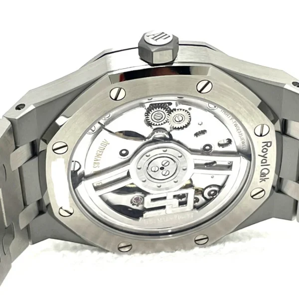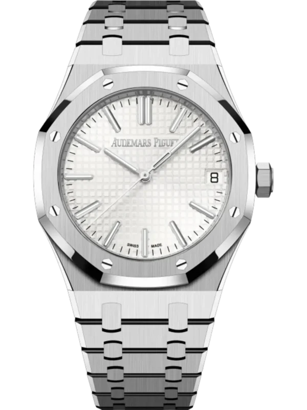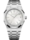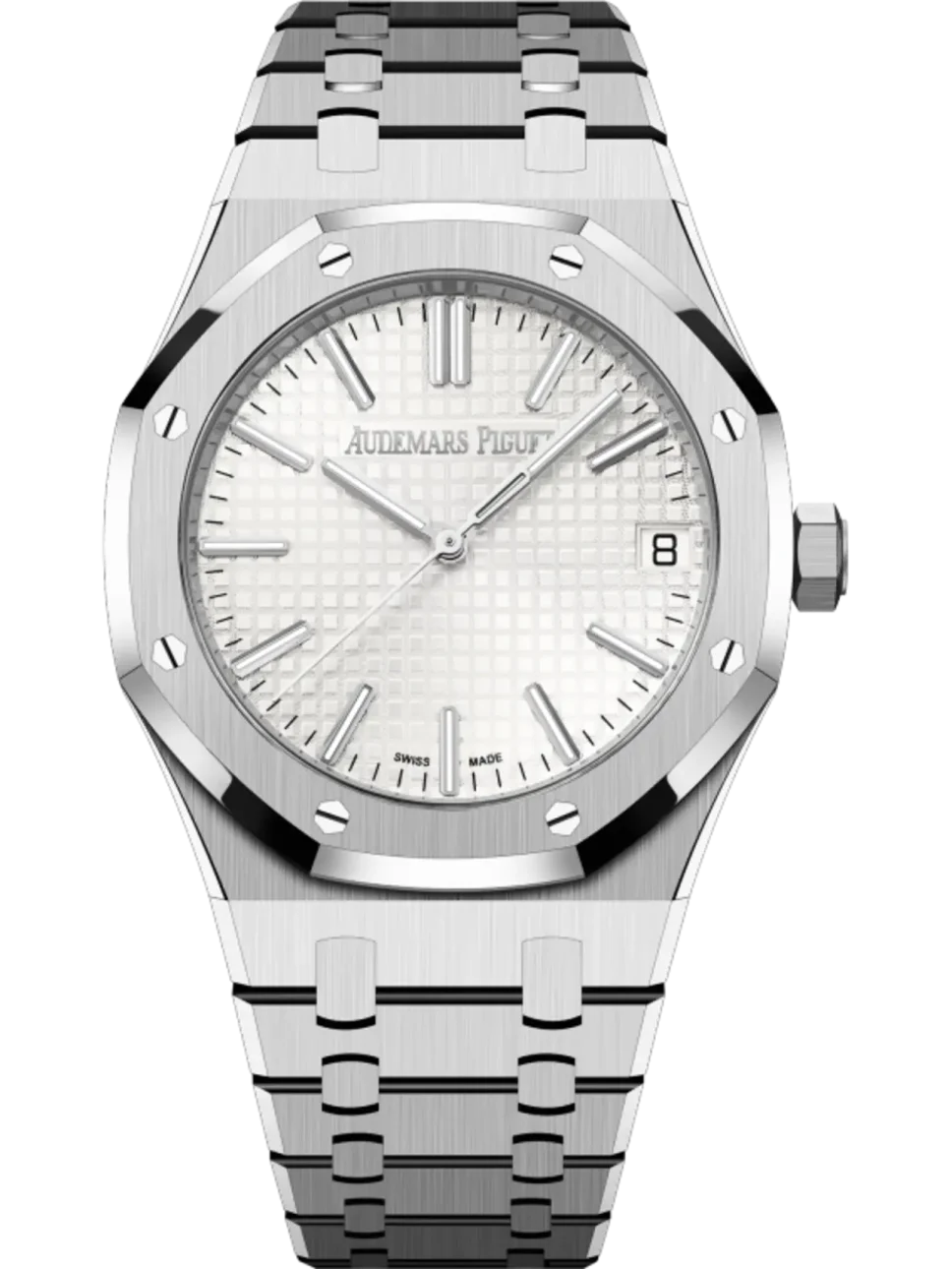 Silver-toned dial with “Grande Tapisserie” pattern, white gold applied hour-markers and Royal Oak hands with luminescent coating.