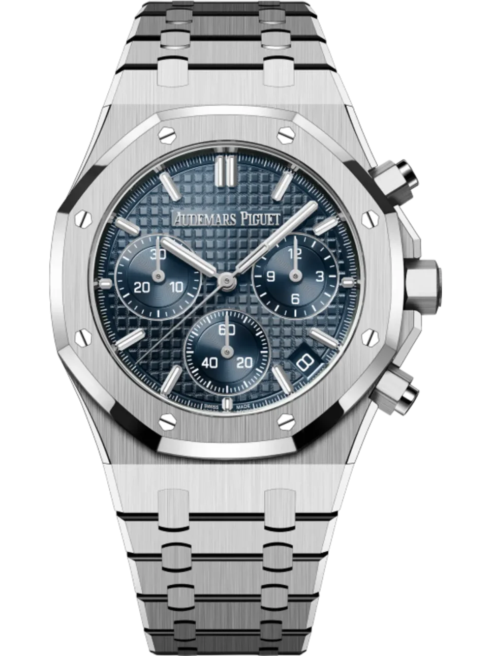 “Bleu nuit nuage 50” dial with “Grande Tapisserie” pattern, “Bleu nuit nuage 50” counters, white gold applied hour-markers and Royal Oak hands with luminescent coating.