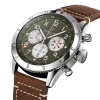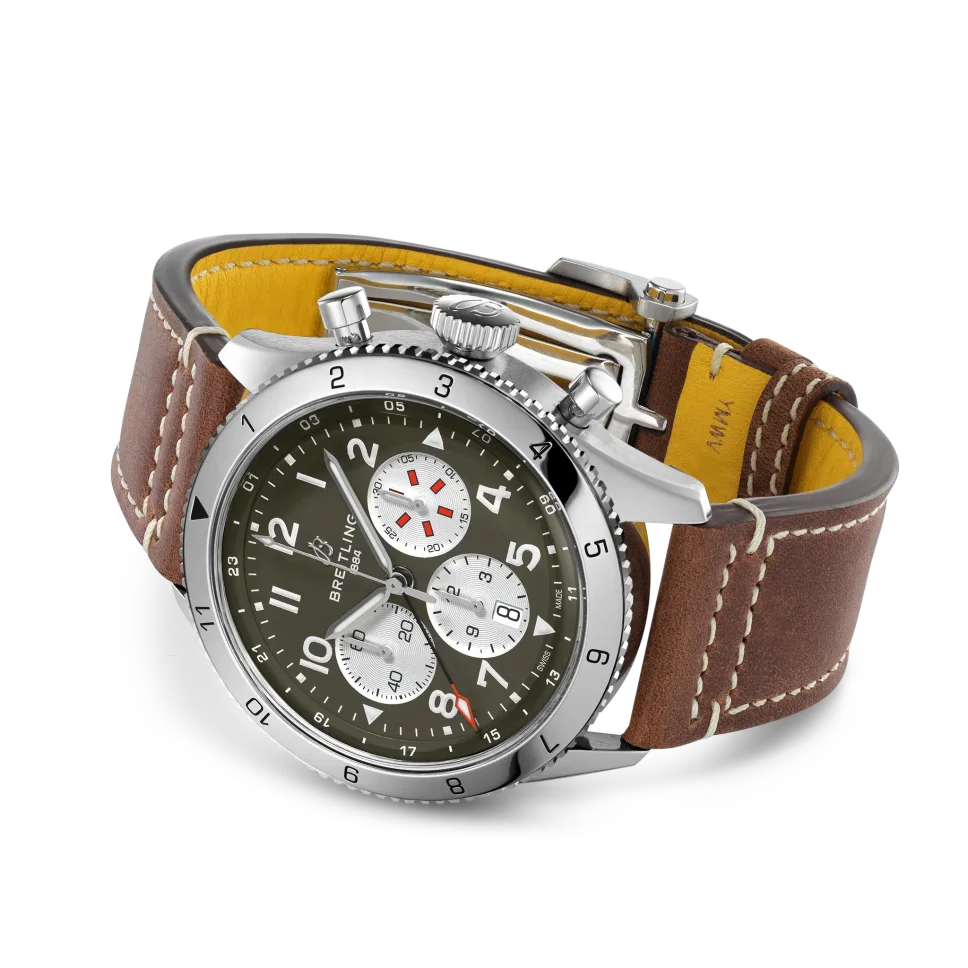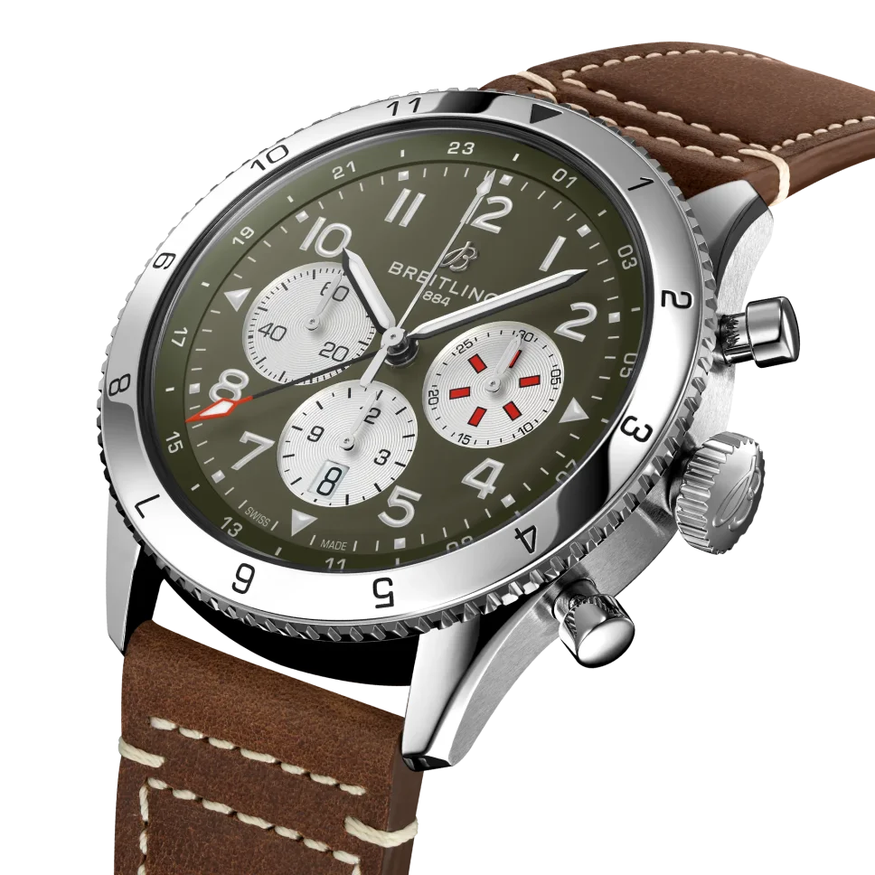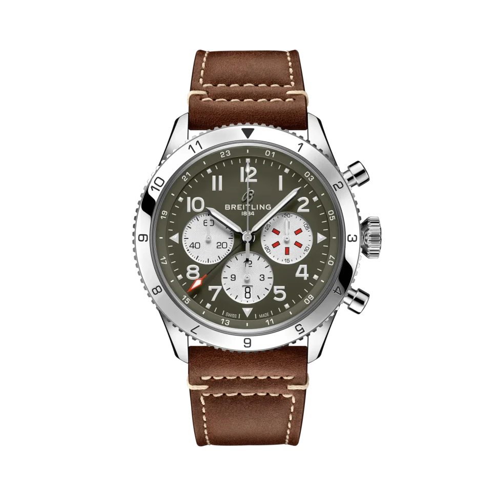 Expertly crafted and equipped for any event, the Breitling Super Avi B04 Curtiss Warhawk 46mm Men’s Watch AB04452A1L1X1 exudes elegance and precision. The robust stainless steel case, measuring 46mm, houses an automatic chronometer-certified movement with a 70-hour power reserve. The green dial boasts Arabic numeral hour markers, a 6 o’clock date window, a chronograph, and a GMT second time zone indicator. With a secure deployment buckle closure, the brown leather strap completes this luxurious timepiece. Prepare to be impressed.
