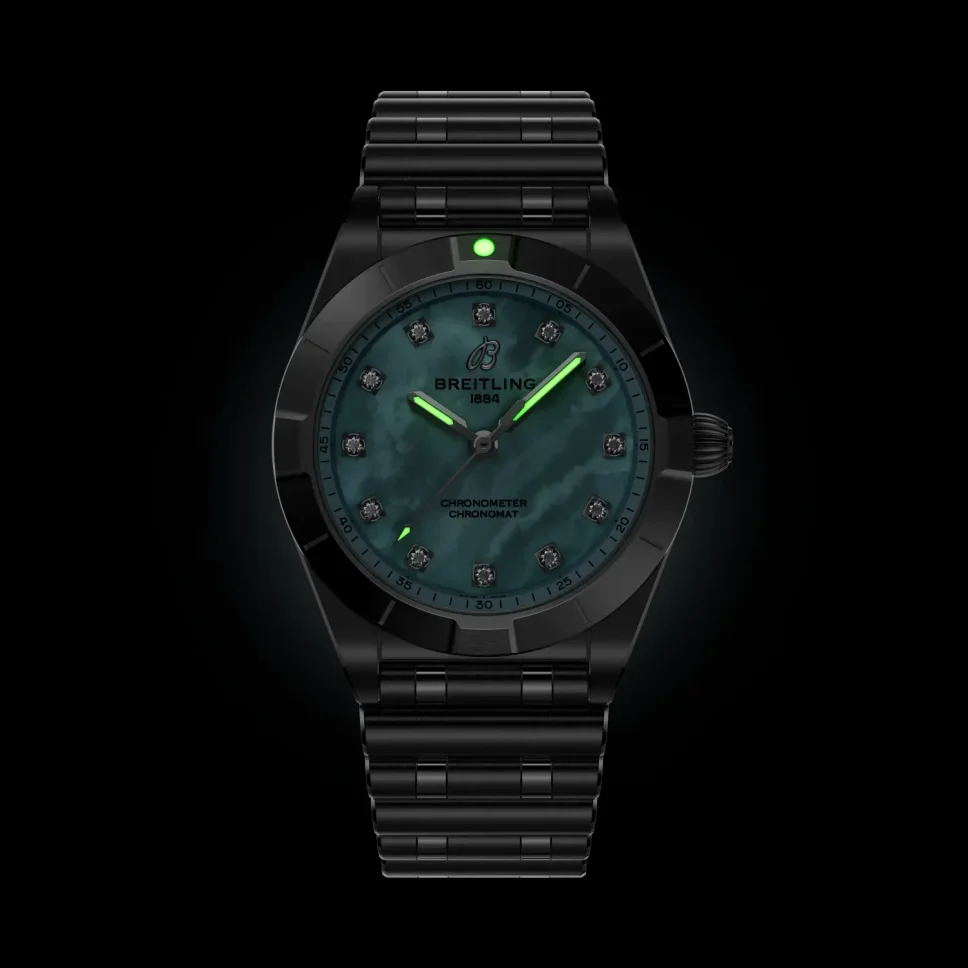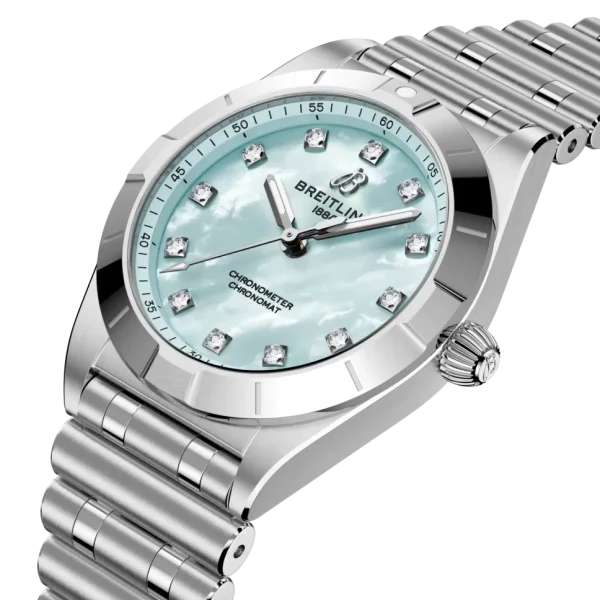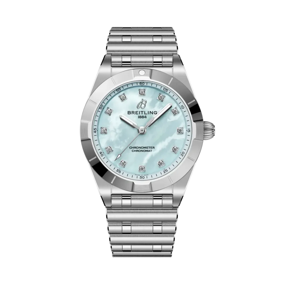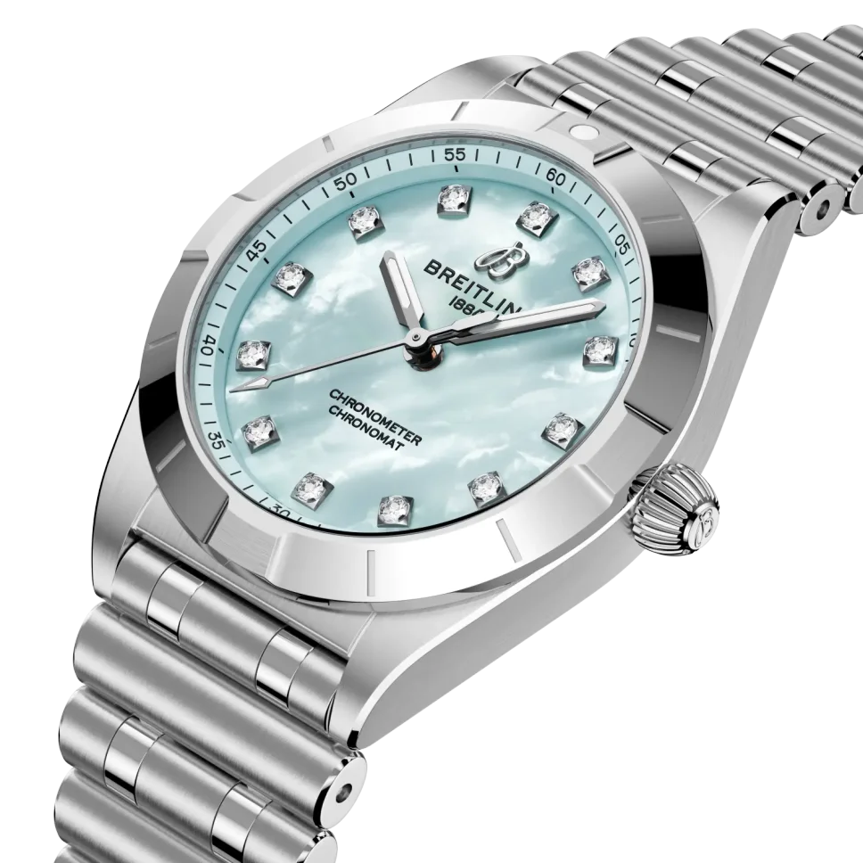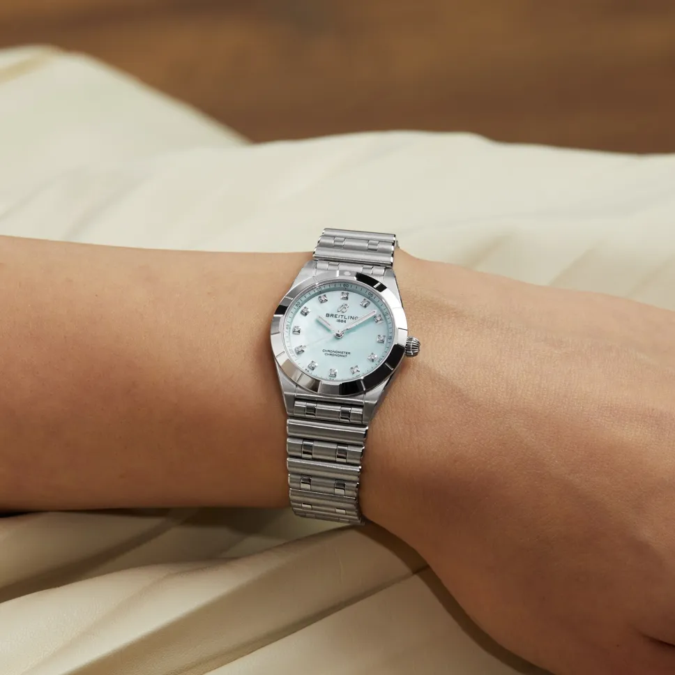 On trend, yet timeless, the petite Chronomat 28 is the versatile sports chic watch for any occasion. These showstoppers have so much more to offer than just their trim new sizes. Mother-of-pearl in various shades and traceable lab-grown diamonds combine with subtle refinements to give the timepieces a jewelry-like appeal. Choose your case and Rouleaux bracelet style: from straight-up stainless steel to mixed-metal duotone—all with a comfortable butterfly folding clasp. The Chronomat 28 is powered by the Breitling Caliber 72, a COSC-certified SuperQuartz™ chronometer.
