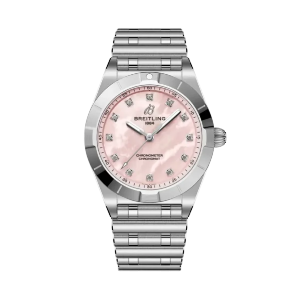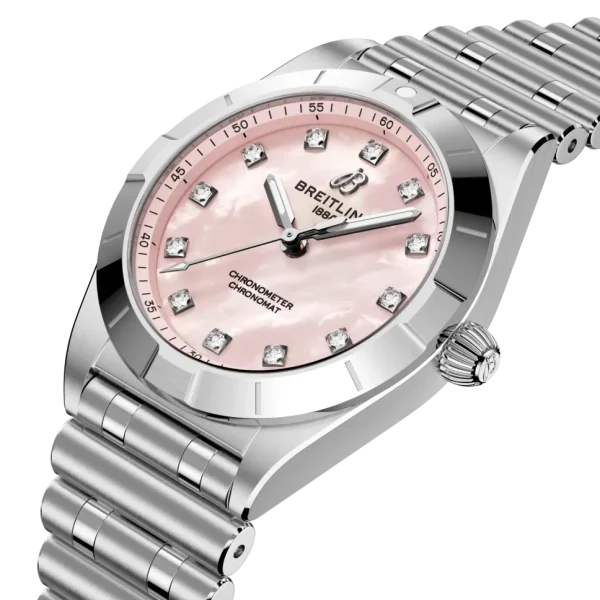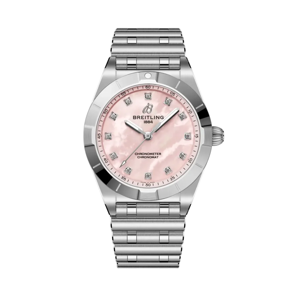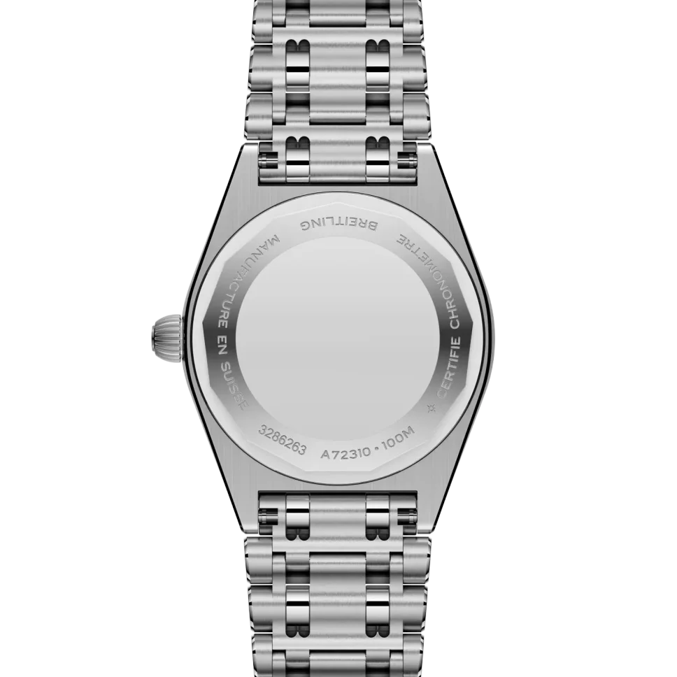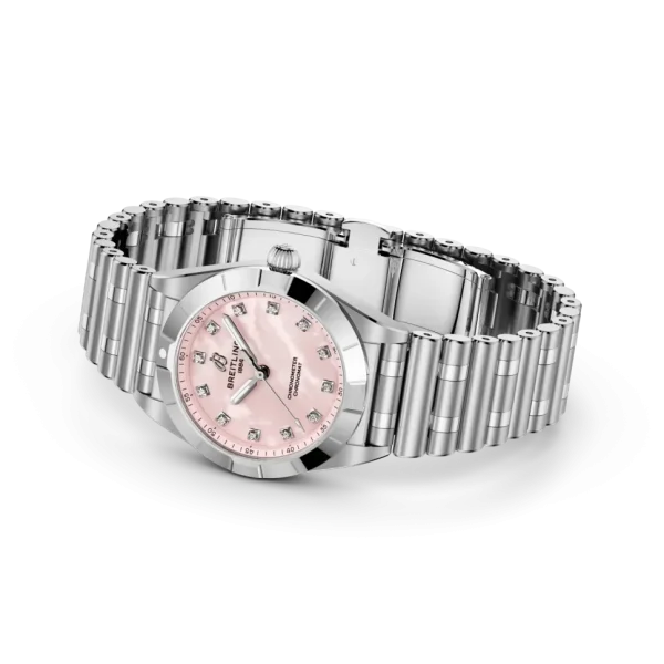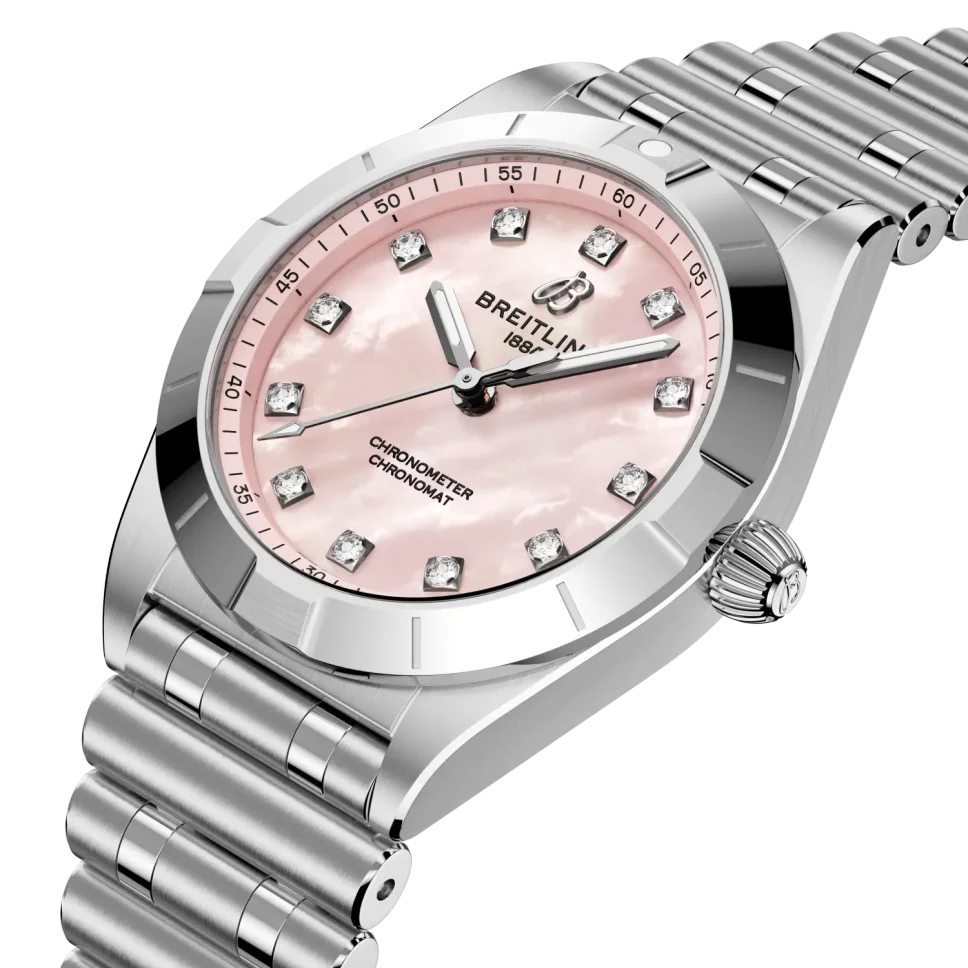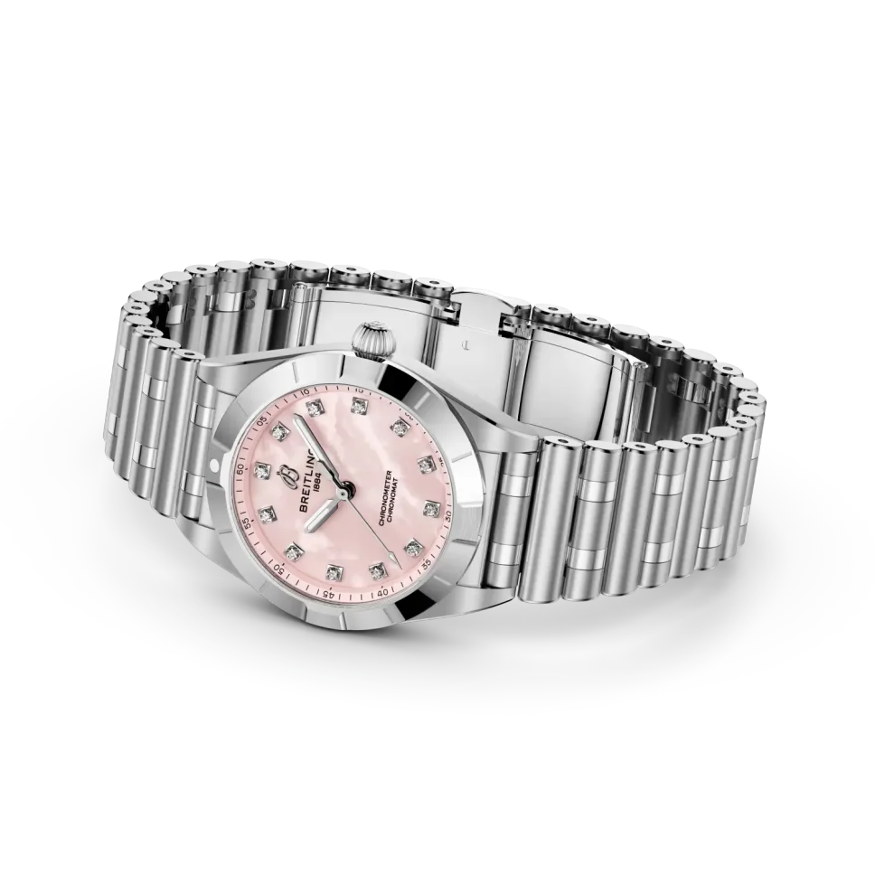 On trend, yet timeless, the petite Chronomat 28 is the versatile sports chic watch for any occasion. These showstoppers have so much more to offer than just their trim new sizes. Mother-of-pearl in various shades and traceable lab-grown diamonds combine with subtle refinements to give the timepieces a jewelry-like appeal. Choose your case and Rouleaux bracelet style: from straight-up stainless steel to mixed-metal duotone—all with a comfortable butterfly folding clasp. The Chronomat 28 is powered by the Breitling Caliber 72, a COSC-certified SuperQuartz™ chronometer.