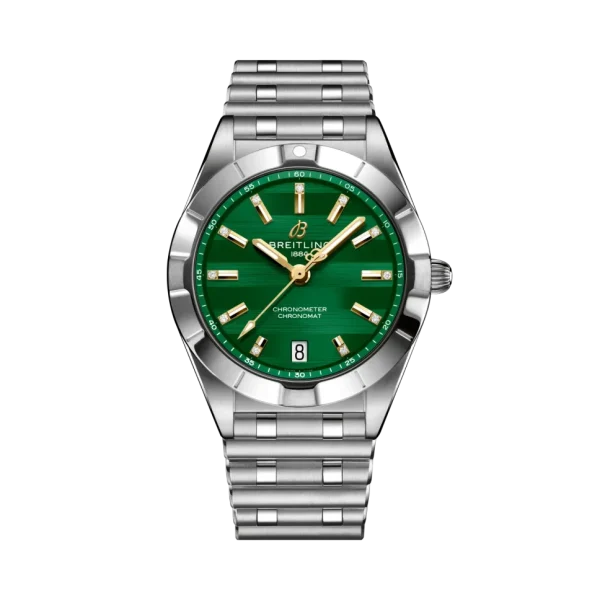 SpecificationsMakeBreitling Chronomat 32 Six Nations IrelandModelChronomatReferenceA773107A1L1A1Diameter32 mmCase MaterialStainless steelDial ColorGreenBezel TypeFixedBezel ColorSilverBezel MaterialStainless steelCrystalCambered sapphire, glareproofed both sidesMovementSuperQuartzBracelet TypeStraightBracelet MaterialStainless steelFunctionsDate (dial aperture), EOL indicatorWater Resistance100 m