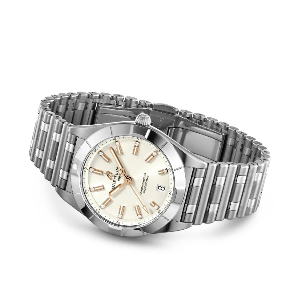 Featuring an array of vibrant dials, straps, and bracelets, all timepieces within the range are certified chronometers recognised by the COSC. This Chronomat 32 is characterised by the iconic Rouleaux bracelet with its butterfly clasp.