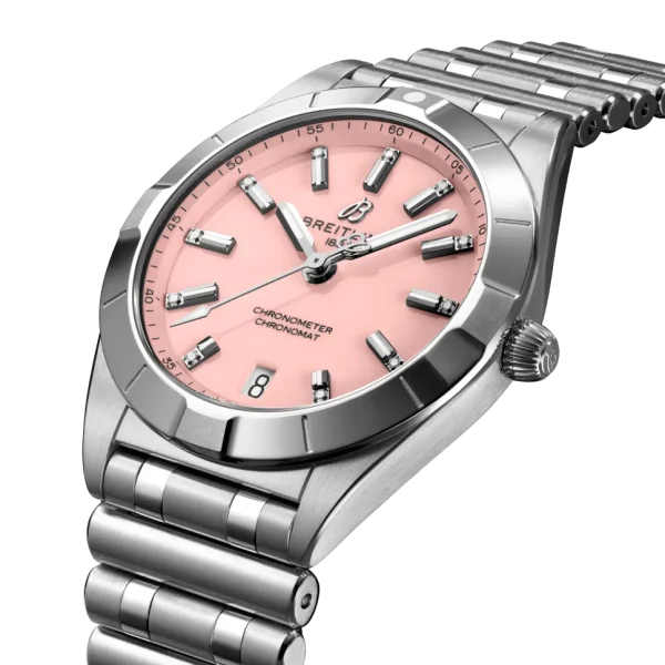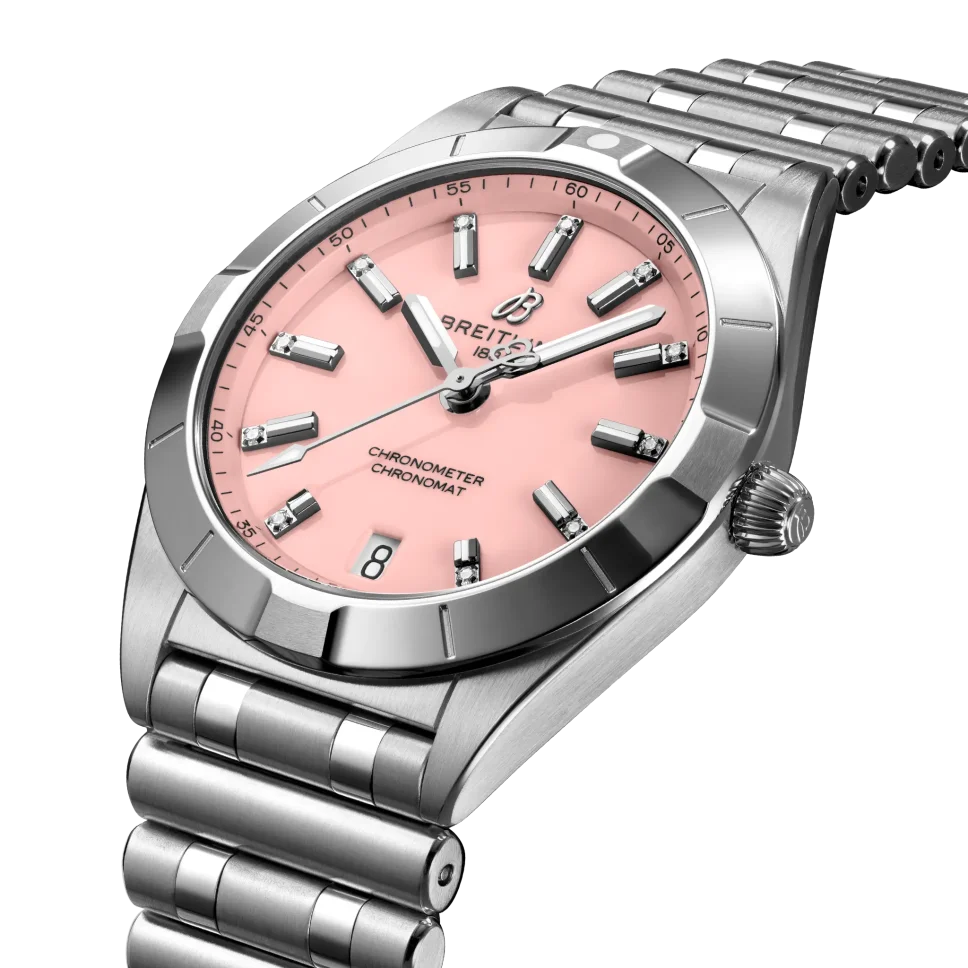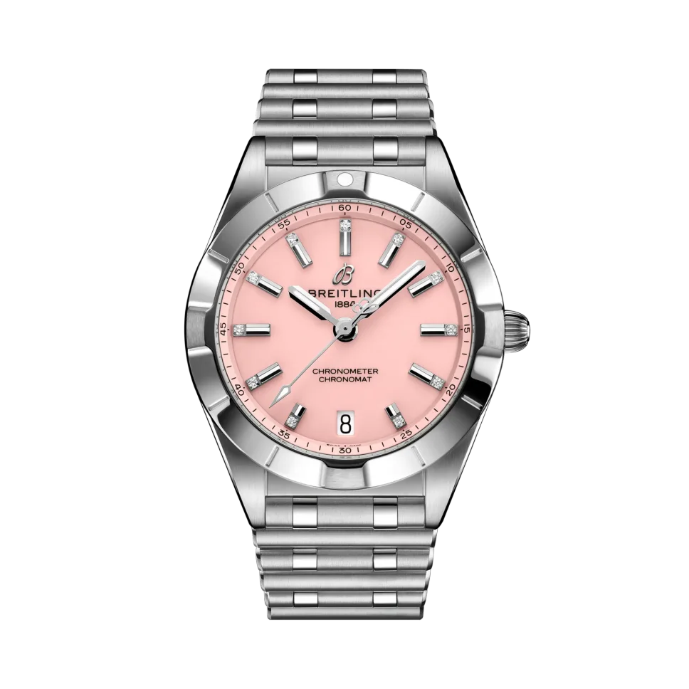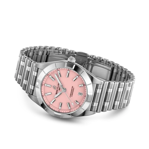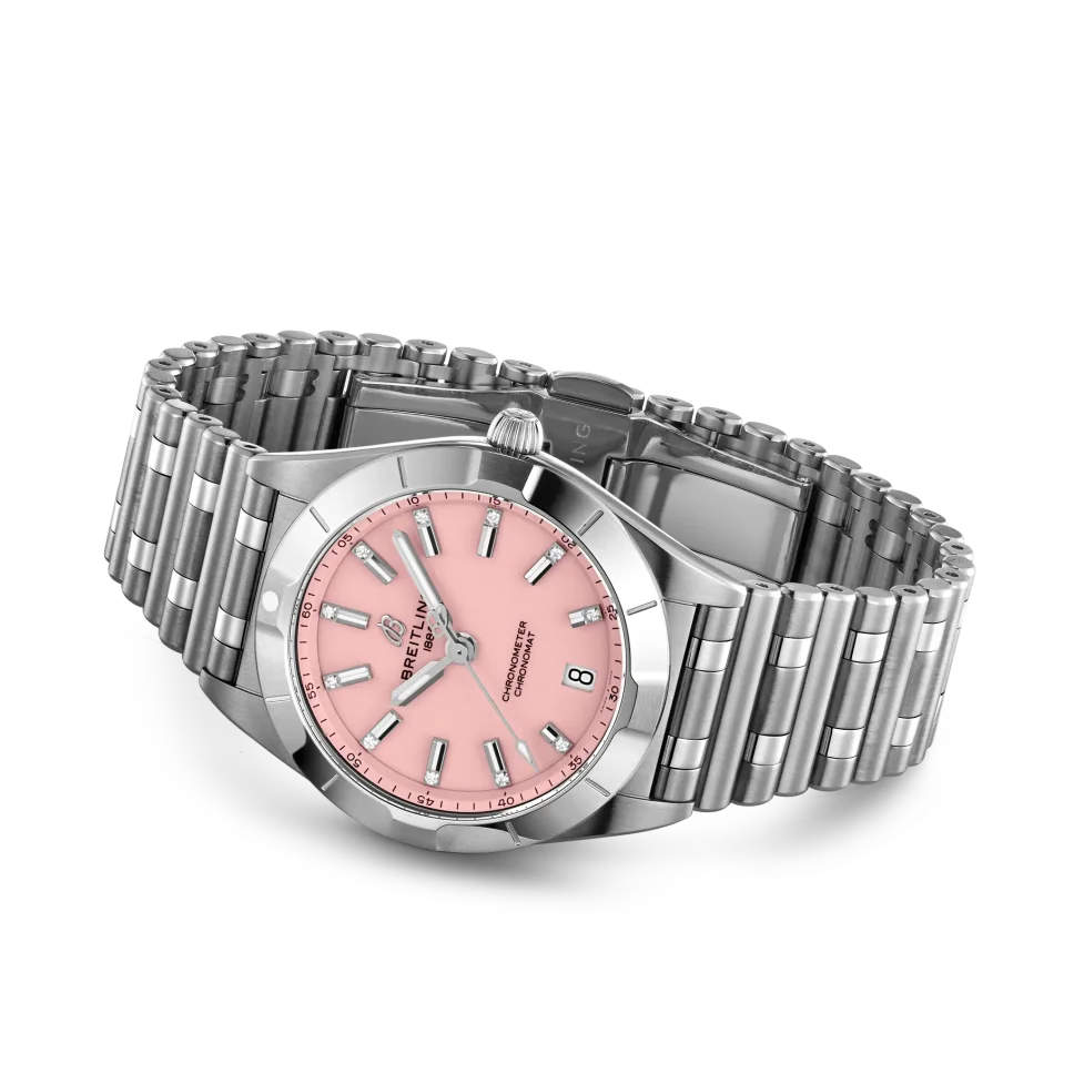 Featuring an array of vibrant dials, straps, and bracelets, all timepieces within the range are certified chronometers recognised by the COSC. This Chronomat 32 is characterised by the iconic Rouleaux bracelet with its butterfly clasp.