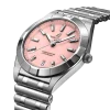 The delicate pink dial showcases 12 glistening diamond hour markers alongside silver hands and a date display.