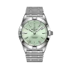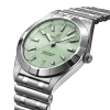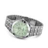 The sage green dial features minimalist silver-tone batons and sparkling diamond dot hour markers, as well as a date display window positioned at 6 o‘clock.