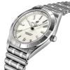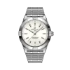 This 36mm model presents a brilliant white dial with silver-tone hands and indexes, and a date display at 6 o’clock.