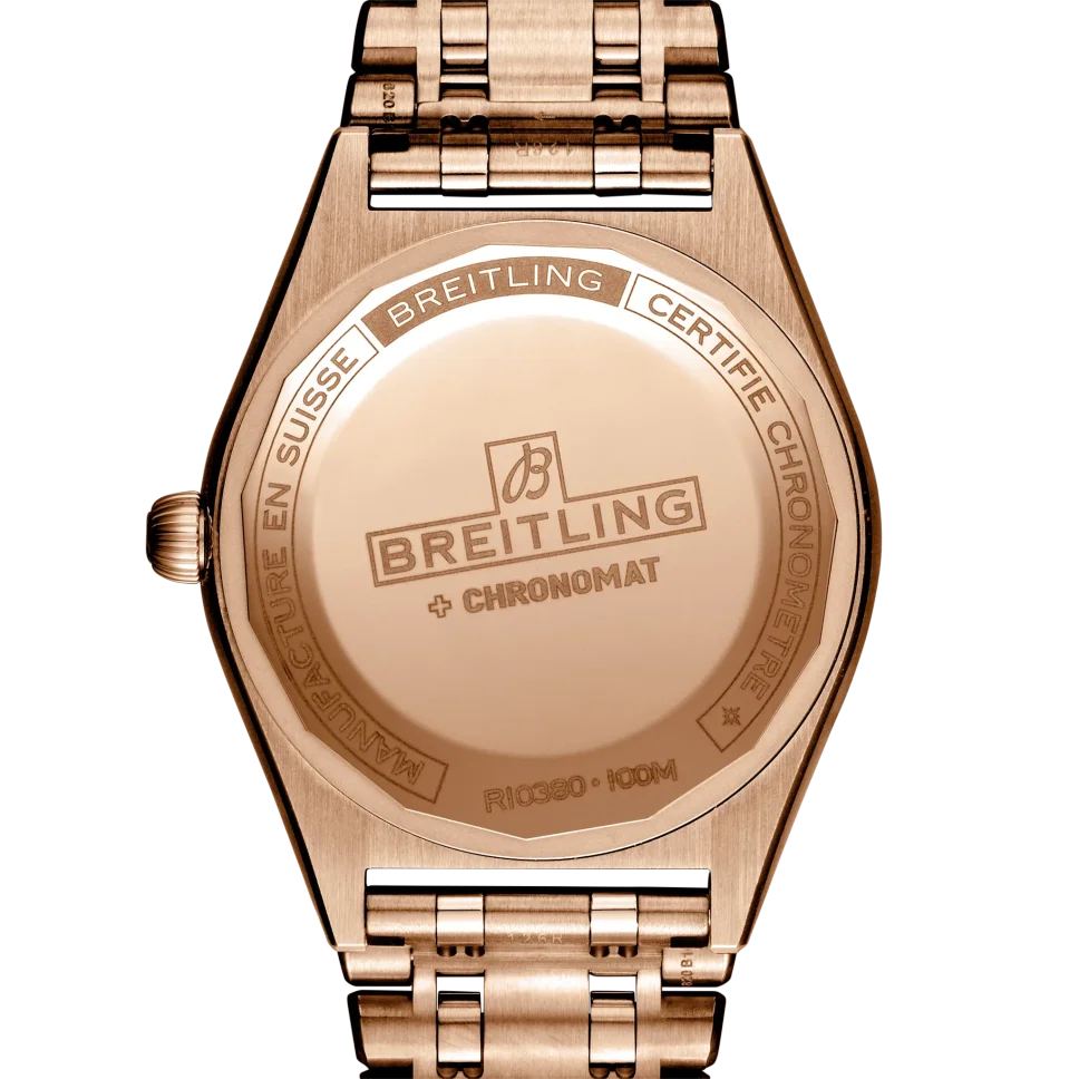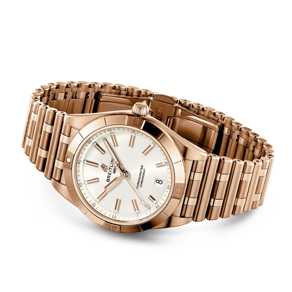The 18K red gold case is presented on a co-ordinating bracelet for an extra touch of refinement, while power is provided by the Breitling 10 calibre movement, certified by COSC.