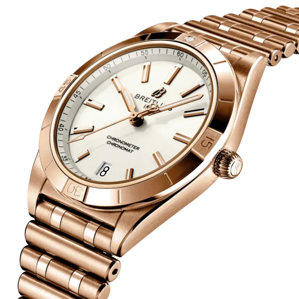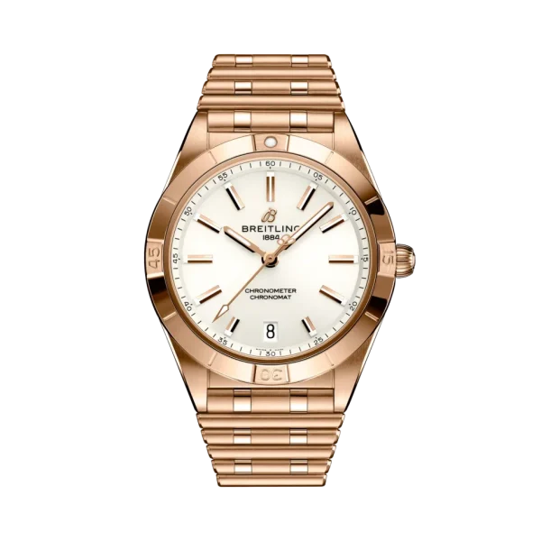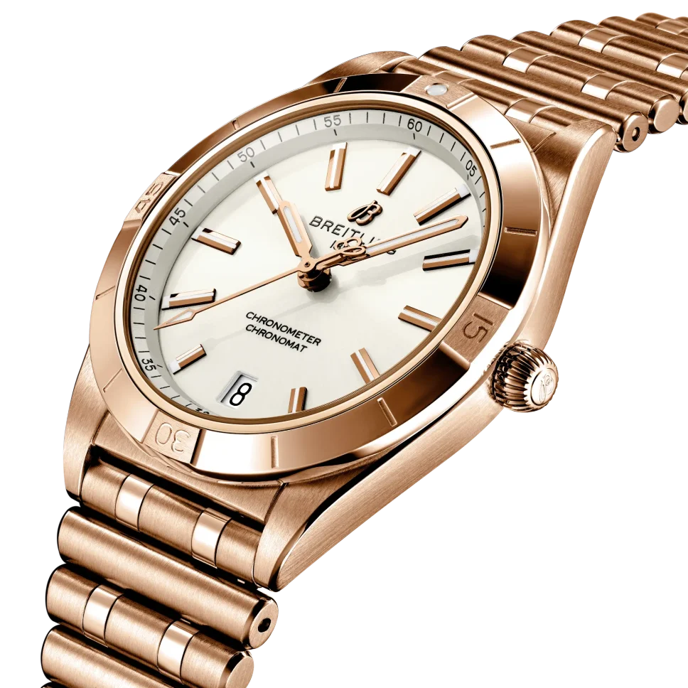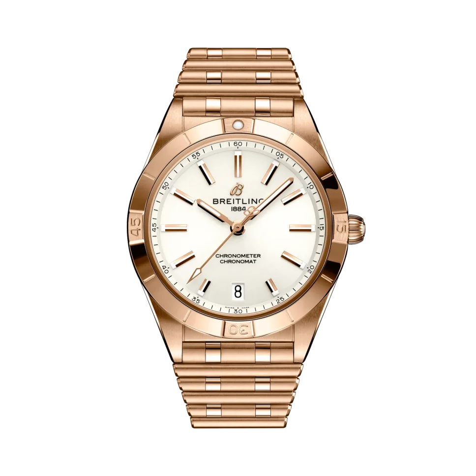 This 36mm Chronomat model boasts an elegant, silver-tone dial with red gold hands and indexes, and a date window at six o’clock.