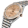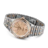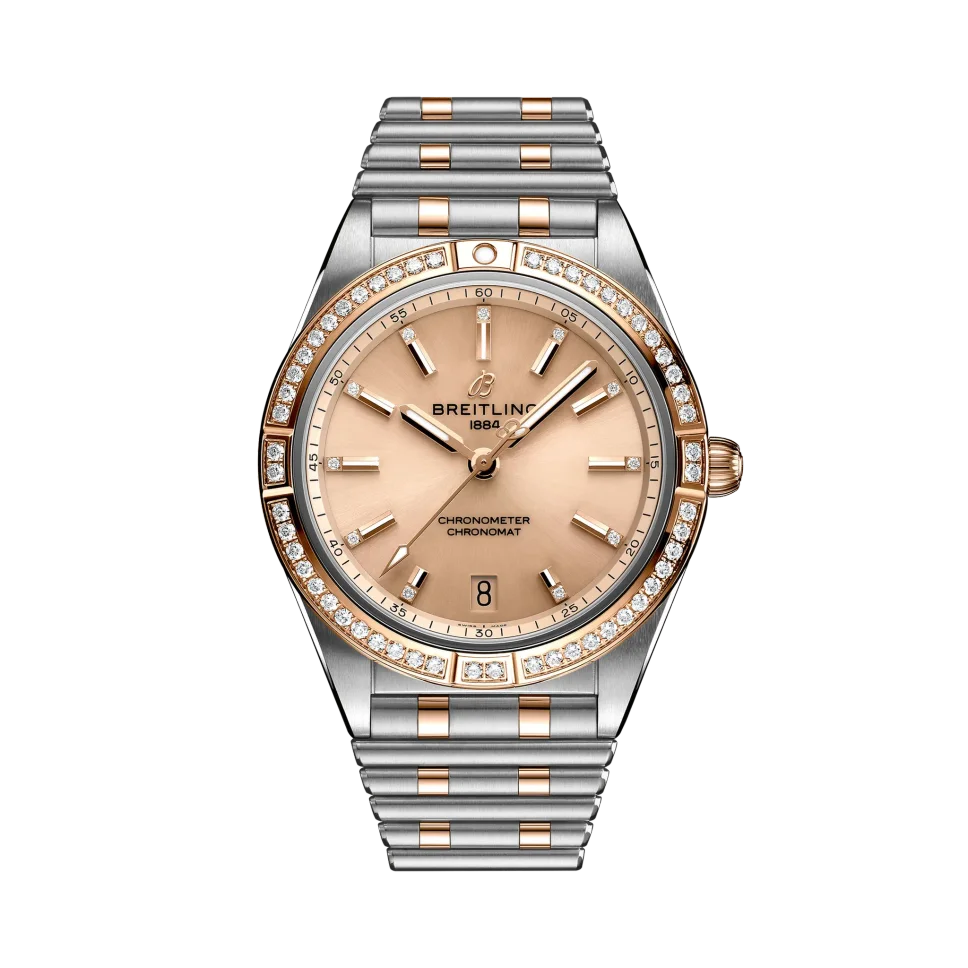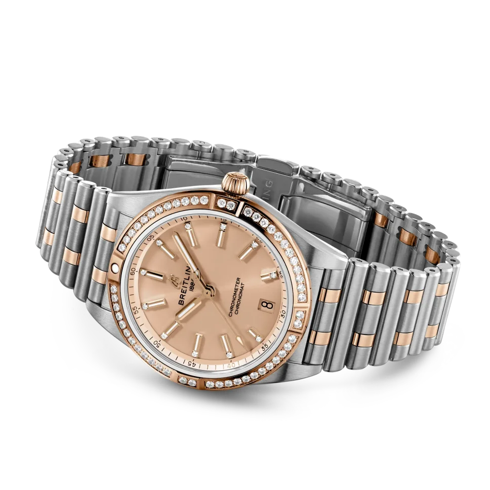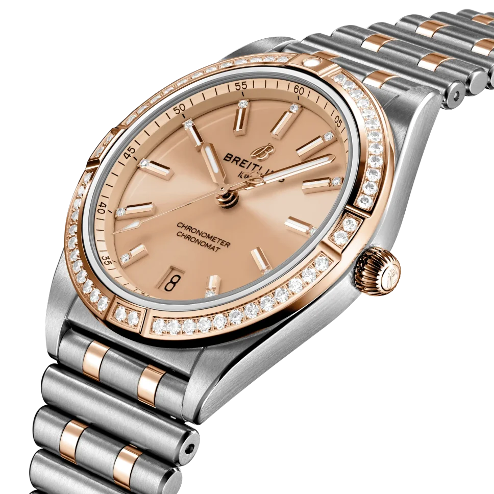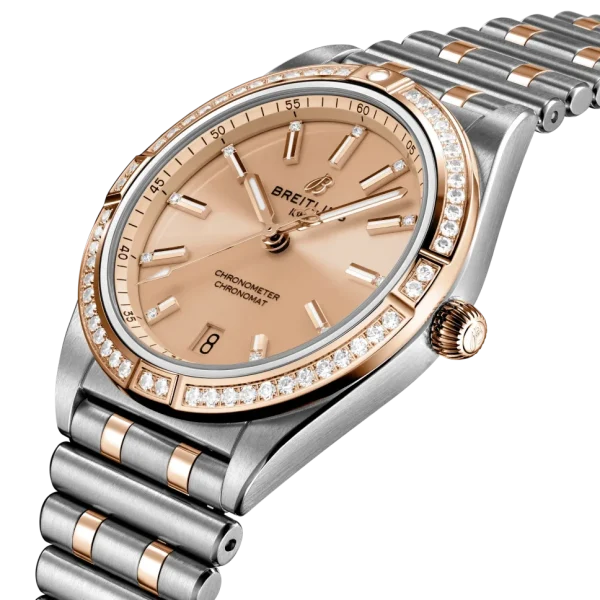 The Breitling Chronomat Automatic 36 Diamond Bezel Women’s Watch U10380591K1U1 offers a sophisticated design with a 36mm stainless steel case, 18k rose gold diamond-set bezel, and two-tone Rouleaux bracelet. The copper dial boasts diamond and index hour markers, along with a convenient 6 O’Clock date window. This watch is expertly powered by the Breitling Caliber 10 self-winding automatic COSC Chronometer certified movement, providing a 42-hour power reserve for reliable performance.