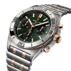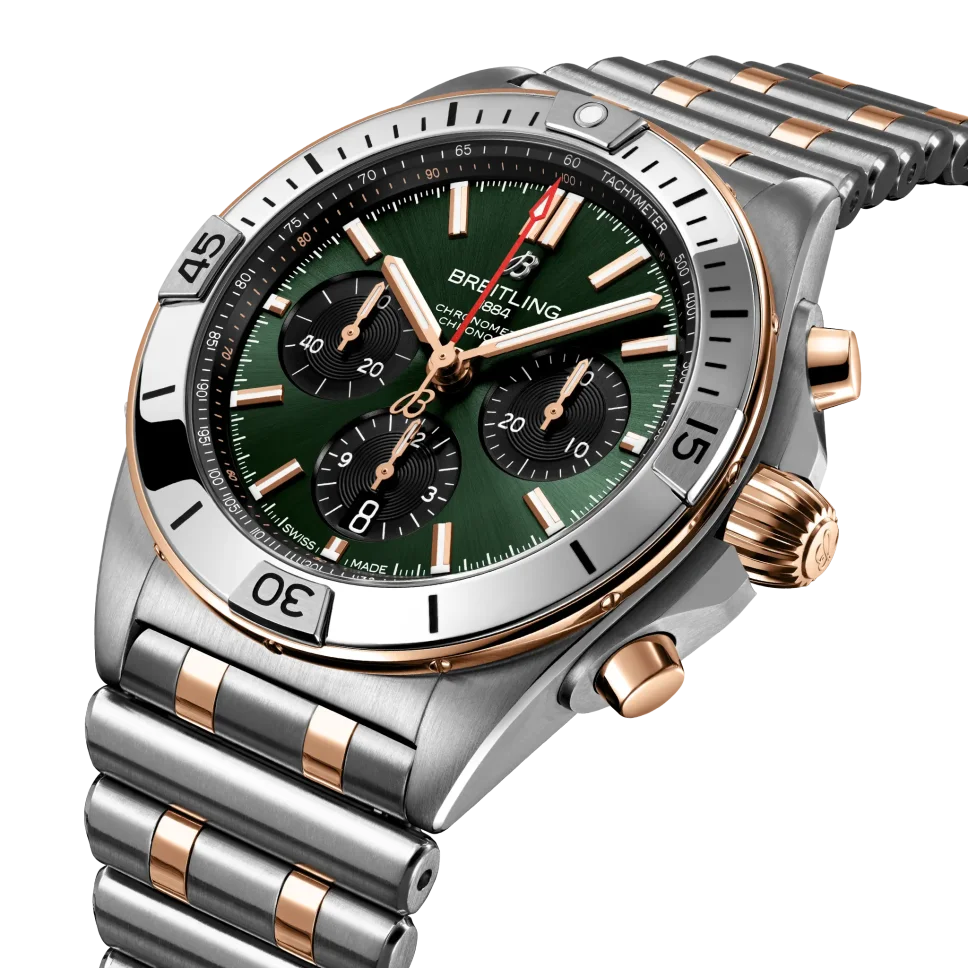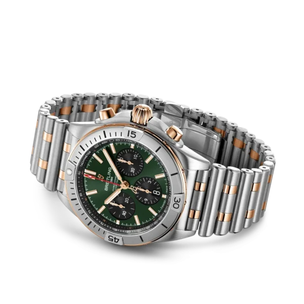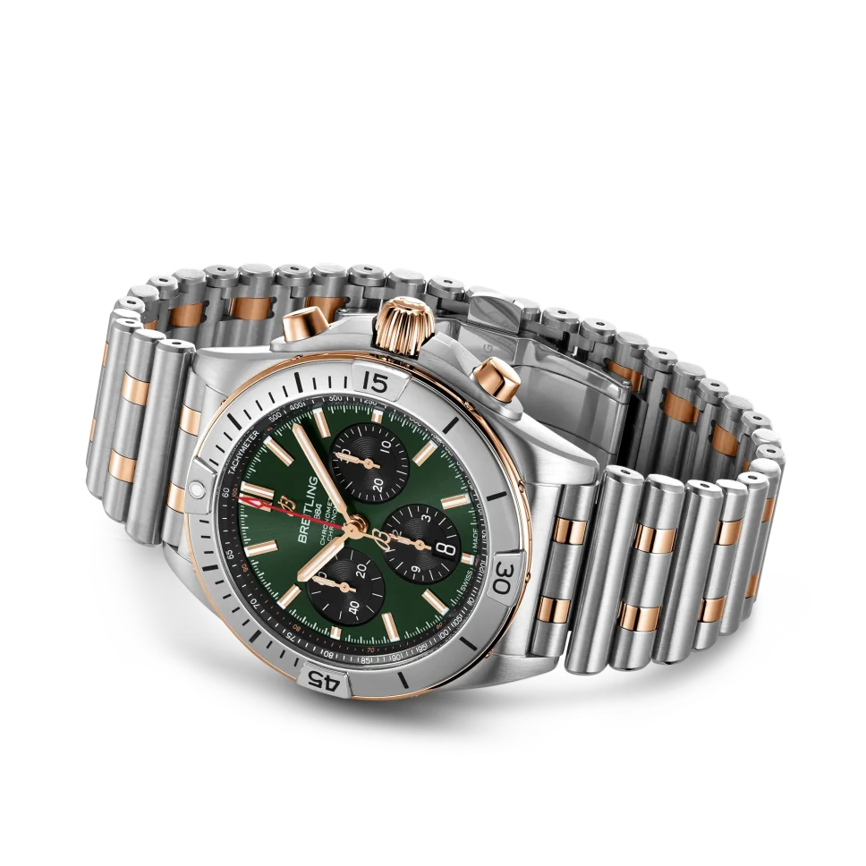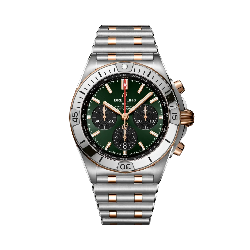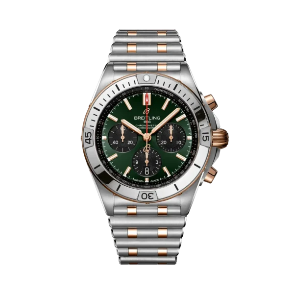 Upgrade your timepiece collection with the Breitling Chronomat B01 42 UB0134131L1U1. This stunning watch features a striking green dial complemented by index hour markers, a convenient date display, and a highly functional chronograph and tachymeter. The 42mm stainless steel and rose gold case adds a touch of sophistication, while the two-tone Rouleaux bracelet with a deployment buckle ensures a comfortable and secure fit. Powered by an automatic movement and certified as a chronometer, this timepiece effortlessly combines luxury and precision in one elegant package. Elevate your style with the timeless elegance of the Breitling Chronomat B01 42 UB0134131L1U1.