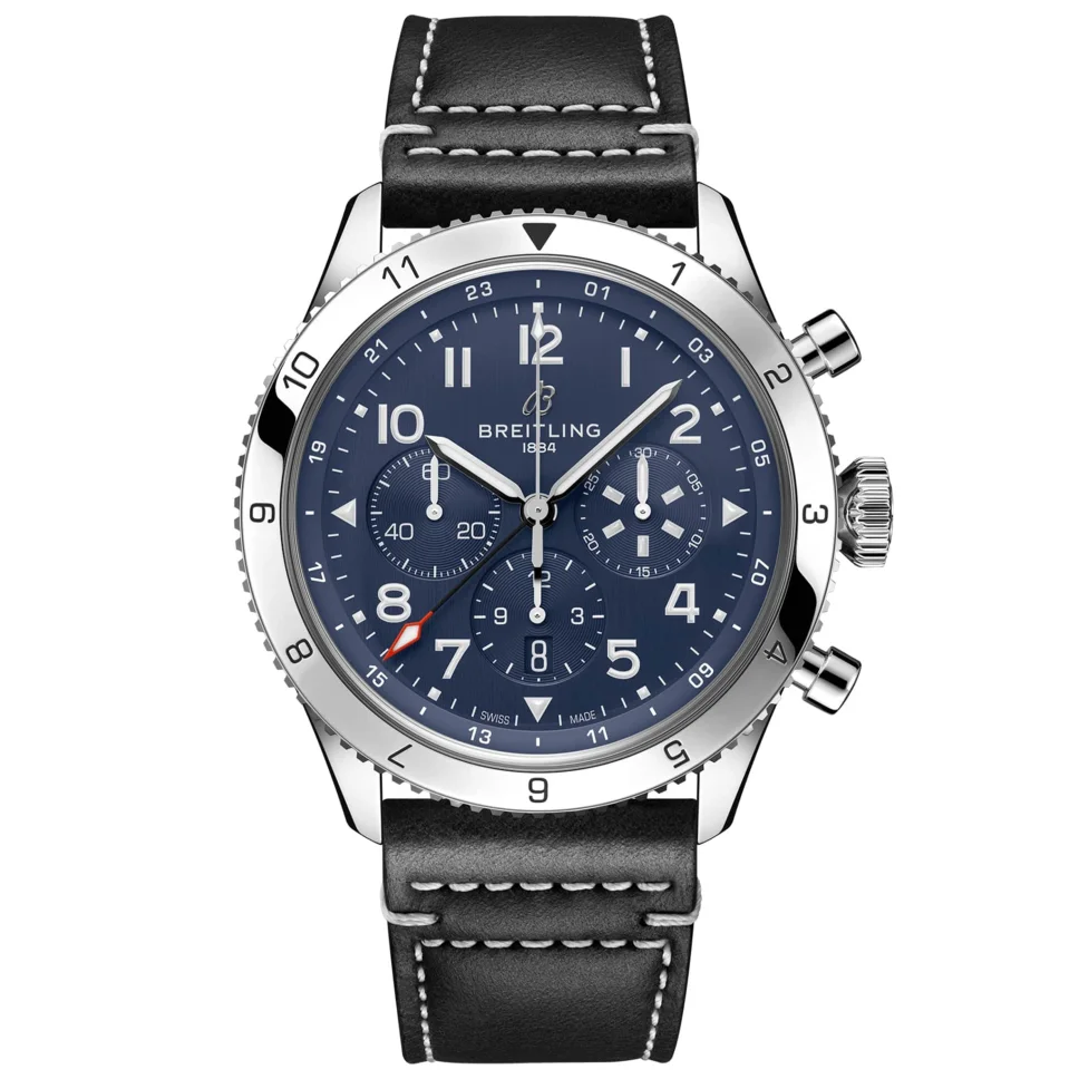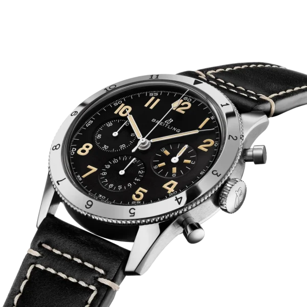 Experience a timeless classic with the Breitling Avi Ref. 765 1953 Re-edition Men’s Watch AB0920131B1X1. This 41mm watch boasts a stainless steel case, a versatile bidirectional rotating bezel, and a sleek black leather strap. Its black dial features luminescent hands and Arabic numeral hour markers, complete with a chronograph and small seconds sub-dial at 9 o’clock. Trust in the precision and reliability of the Breitling Caliber B09 manual winding COSC Chronometer certified movement with a 70-hour power reserve.