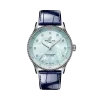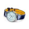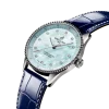 Twelve dazzling diamond hour markers elevate the complementary blue mother of pearl dial.