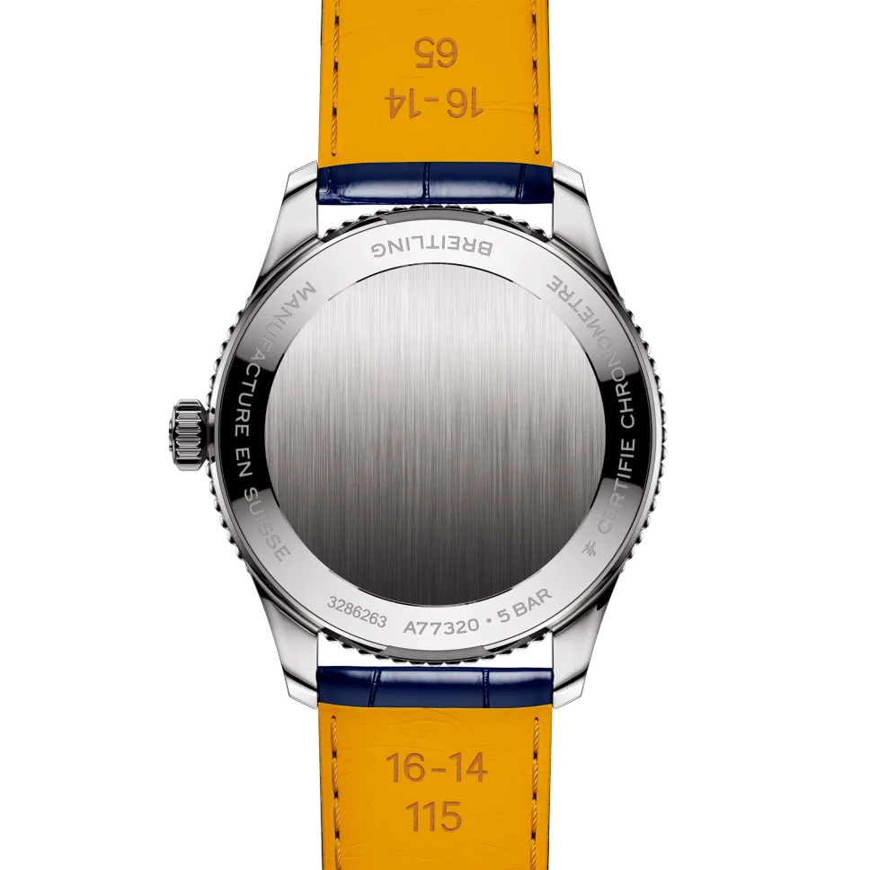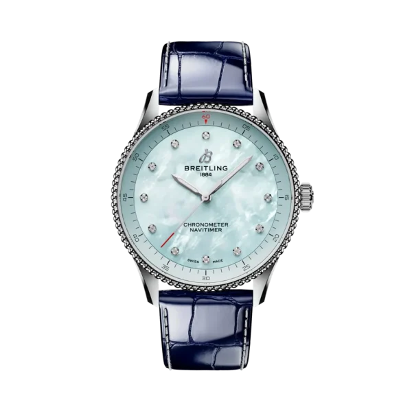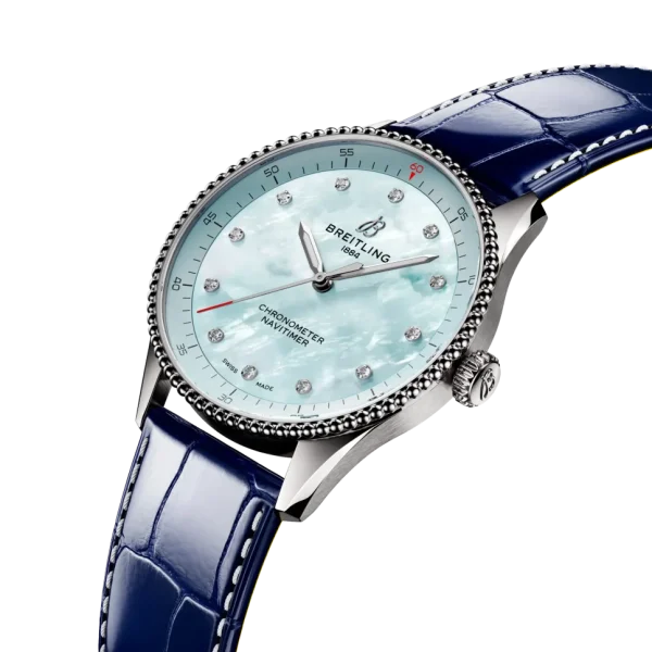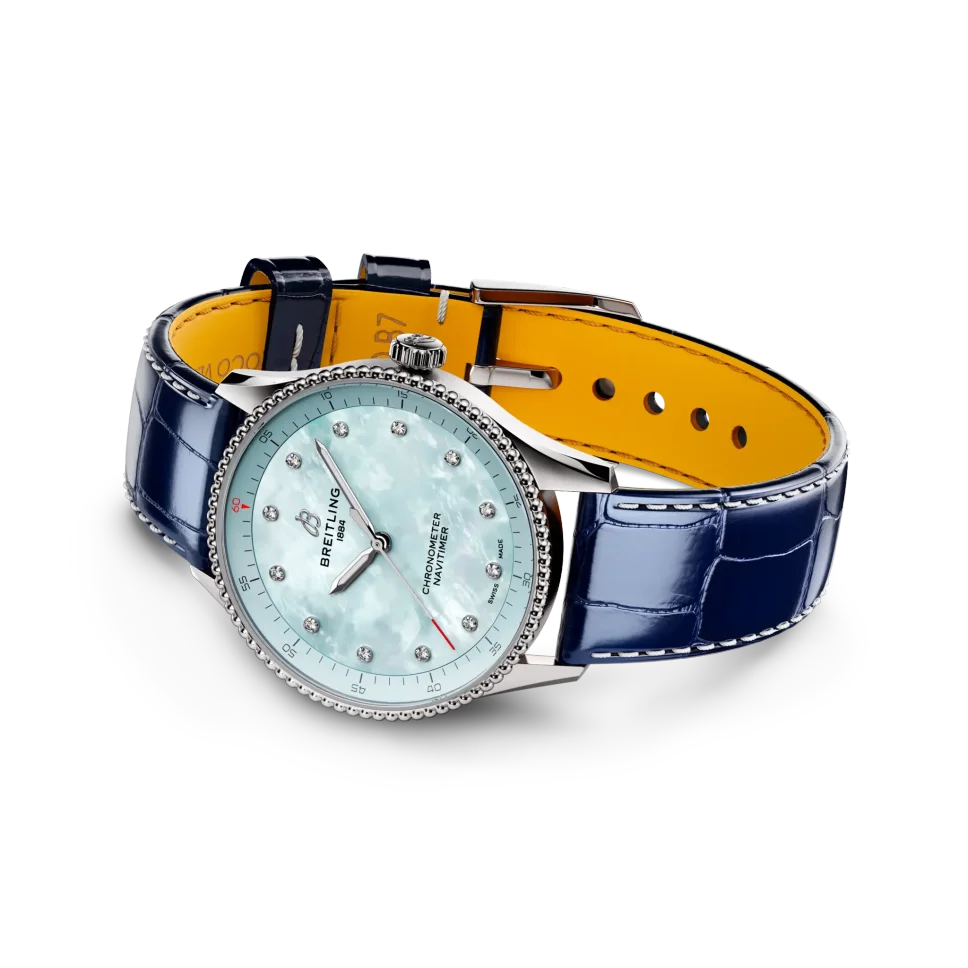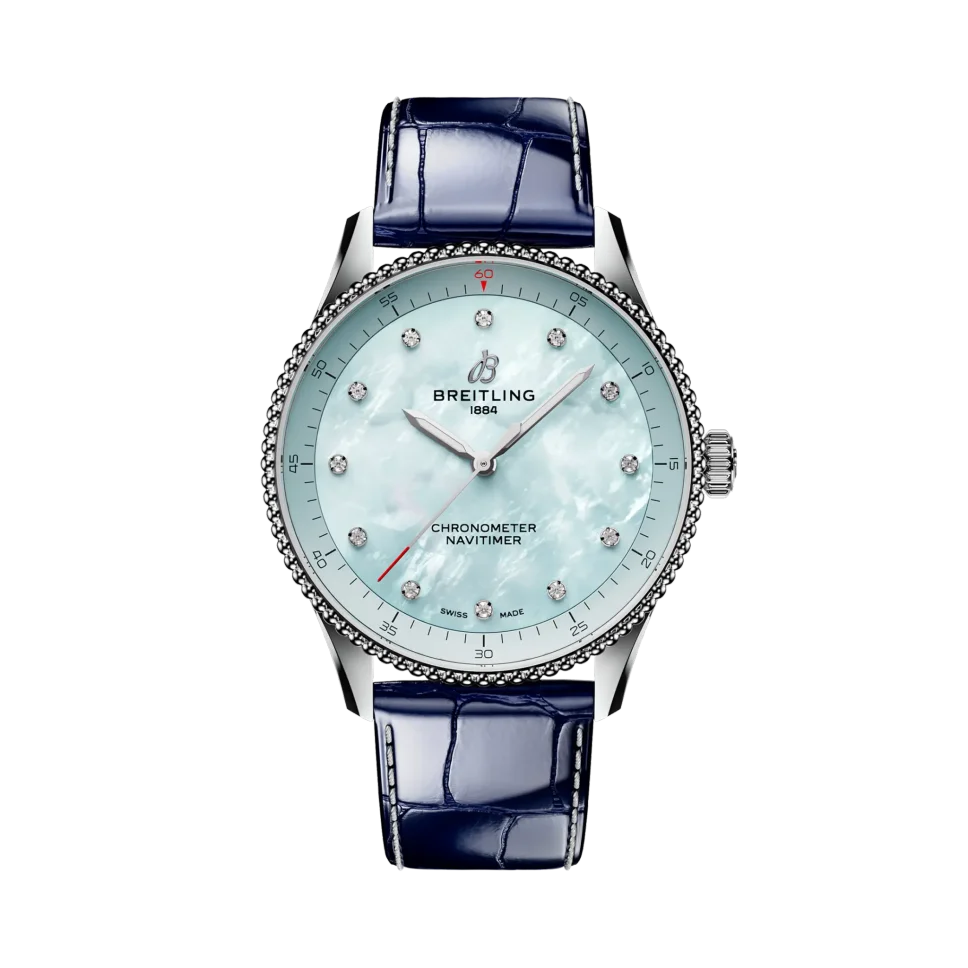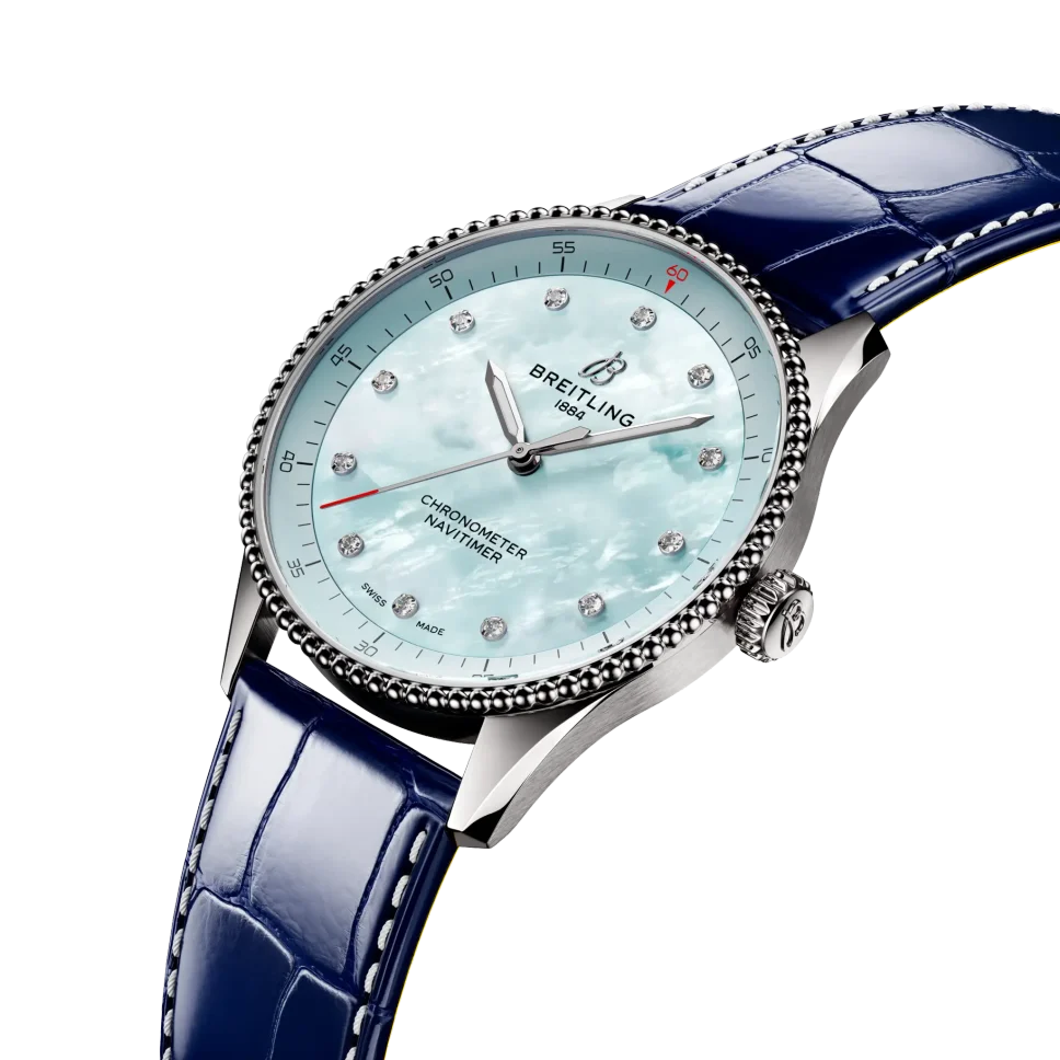 The 32mm stainless steel case is framed by an iconic Navitimer beaded bezel and is presented on a blue alligator leather strap.