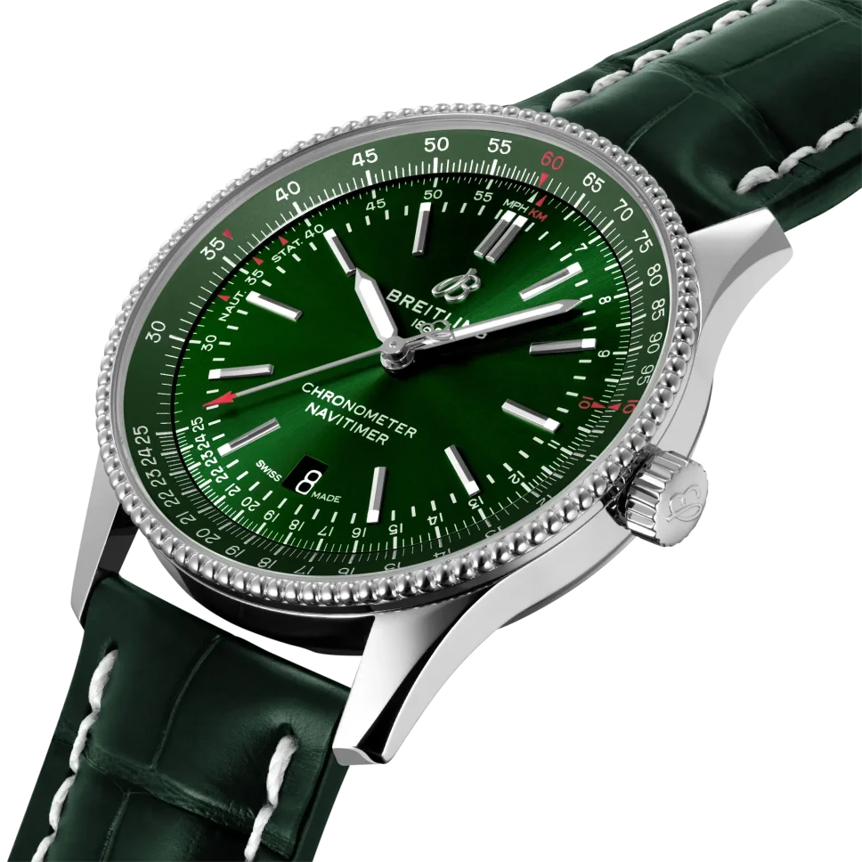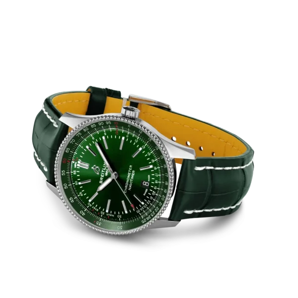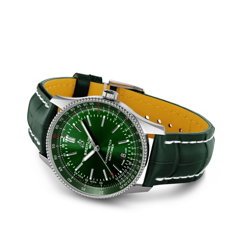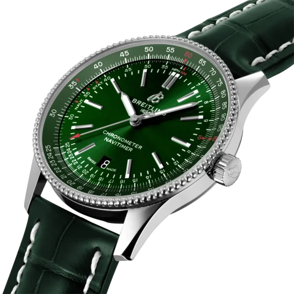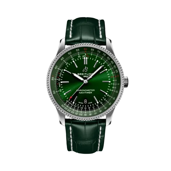 The Breitling Navitimer Automatic 41 A17326361L1P1 combines both style and performance effortlessly. This timeless watch boasts a stainless steel case with fixed bezel and luxurious green dial, featuring index hour markers and a 6 o’clock date window. Its vintage charm is elevated with the addition of a unique slide rule feature, while its automatic chronometer-certified movement guarantees top-notch precision. The sleek 41mm case is paired with a beautiful green leather strap and tang buckle for the ultimate blend of comfort and style. Keep track of time with the Breitling Navitimer Automatic 41 A17326361L1P1.