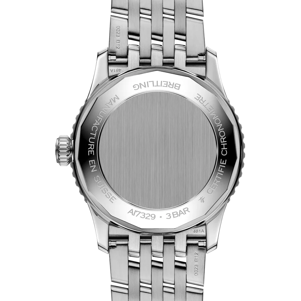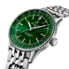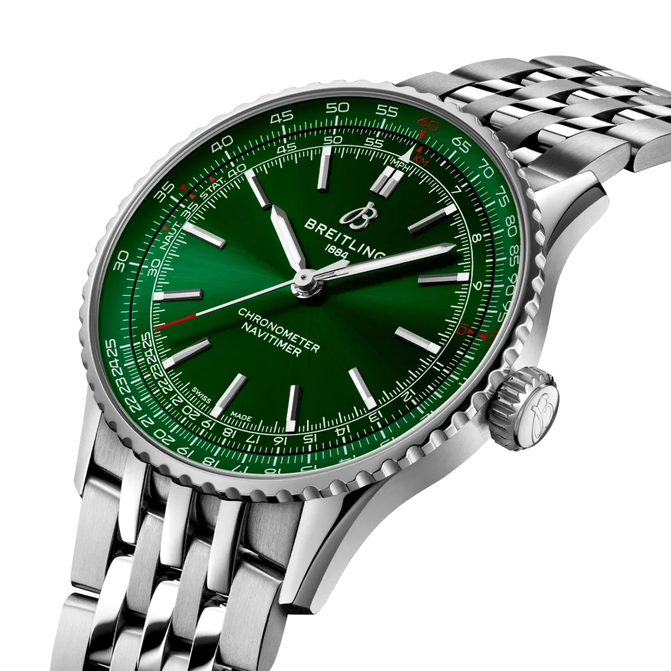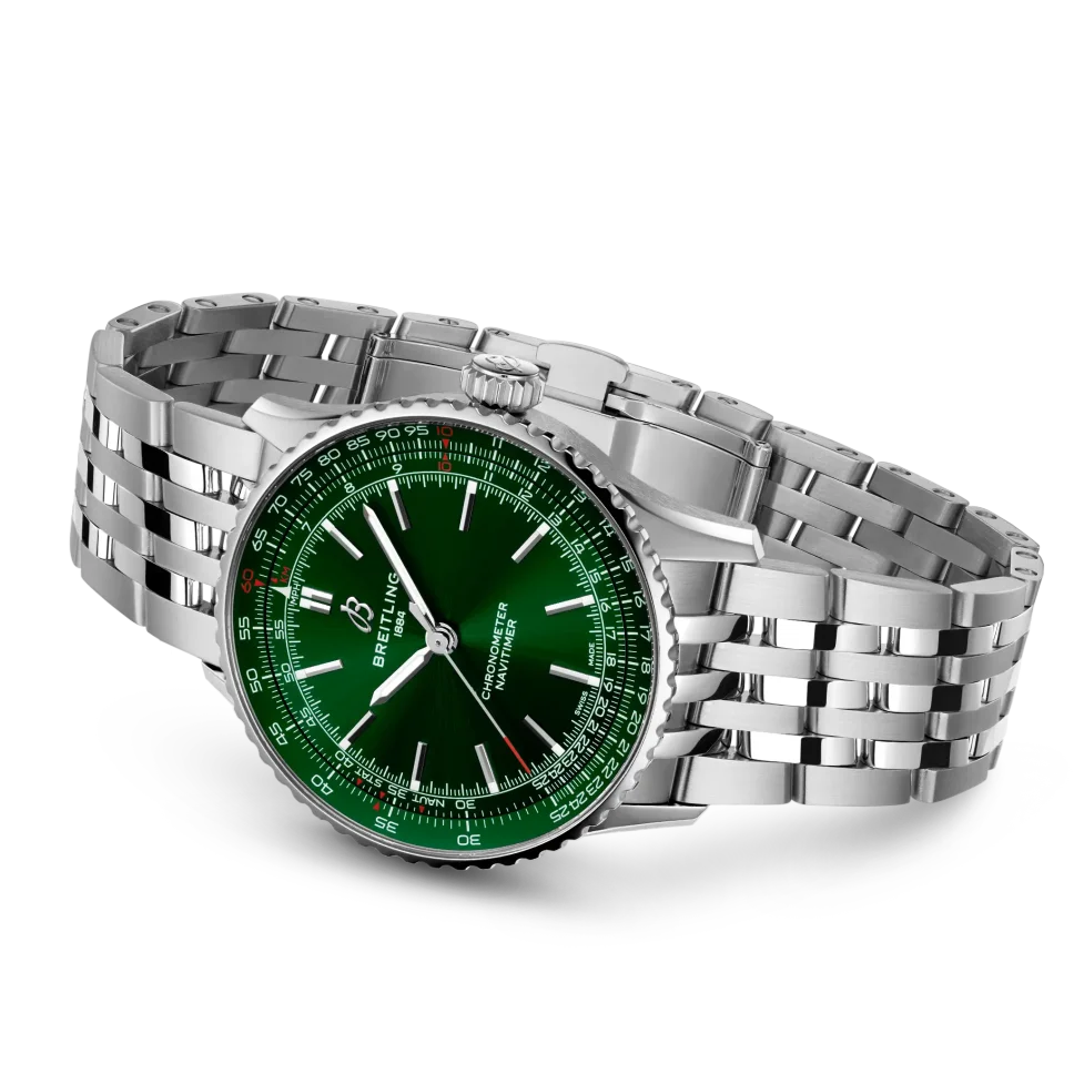 Breitling Navitimer GreenSteel Men’s Watch Model A17329371L1A1Dial GreenStainless Steel case with Silver Stainless Steel watch band.Deployment with Foldover clasp.Bi-directional rotating, slide rule bezel.Dial description: Silver tone hands and Index hour markers with minute markers around the outer rim and 3 sub-dials on a Blue dial.Automatic movement.Calendar: Date at 6 o’clock.Chronograph sub-dials display: 60 Second, 30 Minute, 12 Hours.Powered by Breitling Caliber 01 engine with 70 hours power reserve.Watch functions: Date, Power Reserve, Hour, Minute, Second, Chronograph. Pull/Push crown.Scratch Resistant Sapphire crystal.Round case shape.Case size: 46mm.Case thickness: 13.9mm.30 Meters – 100 Feet water resistant.