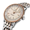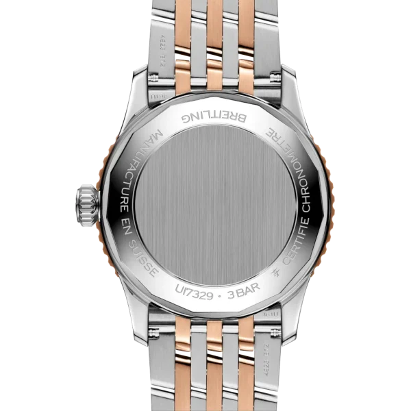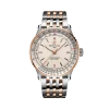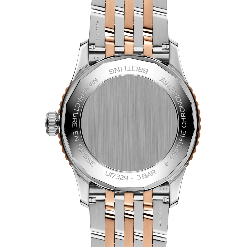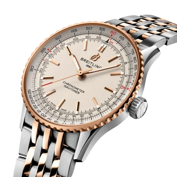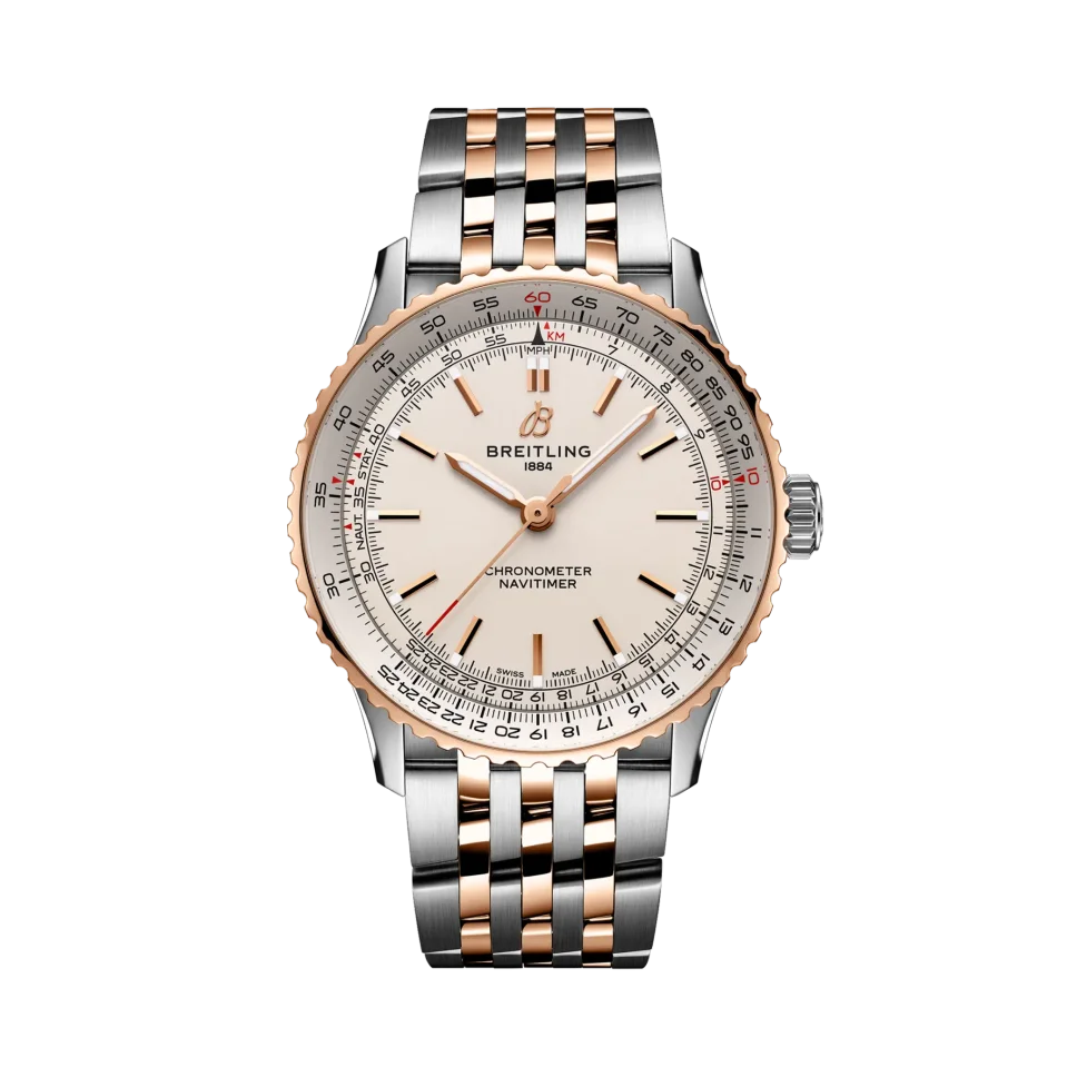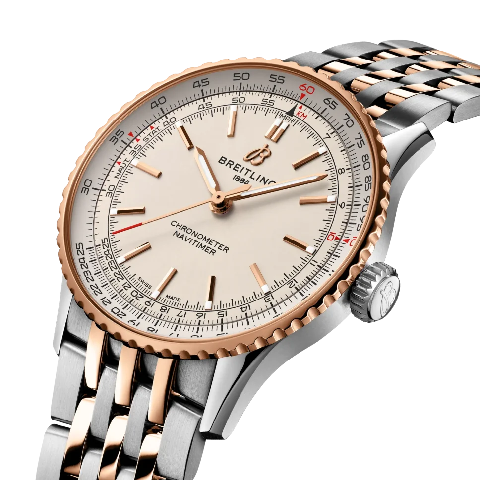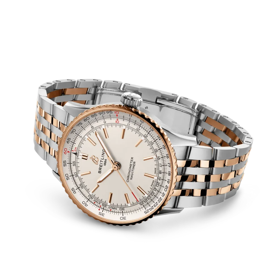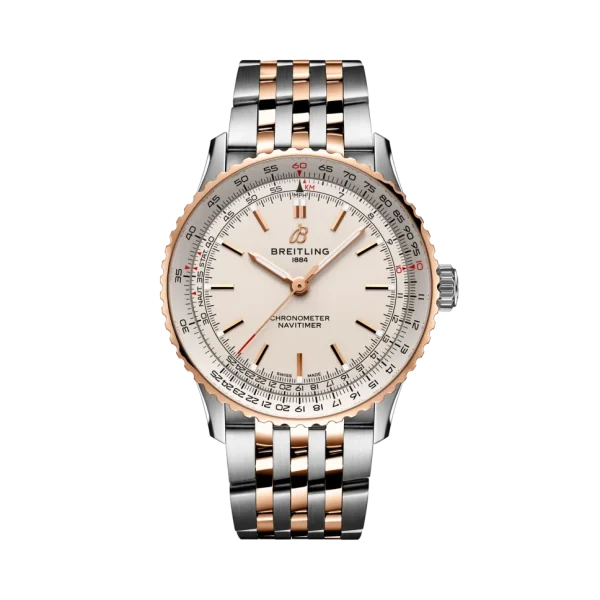 Experience timeless elegance with the Breitling Navitimer Automatic 41 U17329F41G1U1. This exquisite timepiece features a sleek silver dial accented by index hour markers and a slide rule for added functionality. The 41mm stainless steel case is complemented by an 18k rose gold notched bezel, combining luxury with durability. The steel bracelet with deployment buckle ensures a comfortable fit for everyday wear. Equipped with automatic movement and certified as a chronometer, this watch seamlessly blends style and precision. Elevate your look with the sophisticated charm of the Breitling Navitimer Automatic 41.