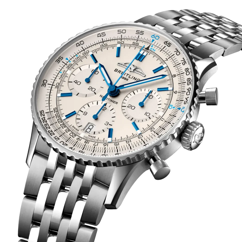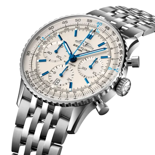 Introducing the epitome of aviation elegance: the Breitling Navitimer B01 Chronograph 41. Offered in unworn condition as a full set, this masterpiece includes the original Breitling box, booklets, and Breitling warranty card dated 2024, ensuring authenticity and peace of mind. With its iconic circular slide rule bezel and 41mm stainless steel case, this watch pays homage to Breitling’s rich aviation heritage. Inside beats the legendary Breitling Manufacture Caliber B01 movement, renowned for its precision and reliability. The striking Cream dial features contrasting silver subdials, offering optimal readability and a touch of sophistication. Water-resistant up to 30 meters, it’s ready to accompany you on any journey, whether in the air or on land. Elevate your style and embrace the spirit of adventure with the Breitling Navitimer B01 Chronograph 41, where precision meets elegance in perfect harmony. Experience the thrill of flight with this iconic timepiece that captures the essence of aviation excellence.