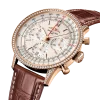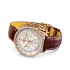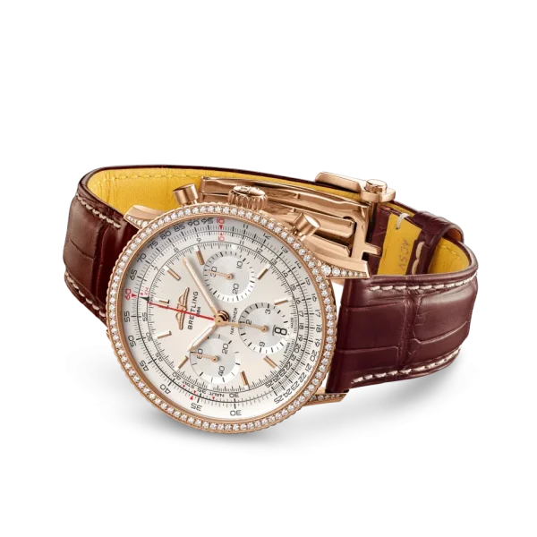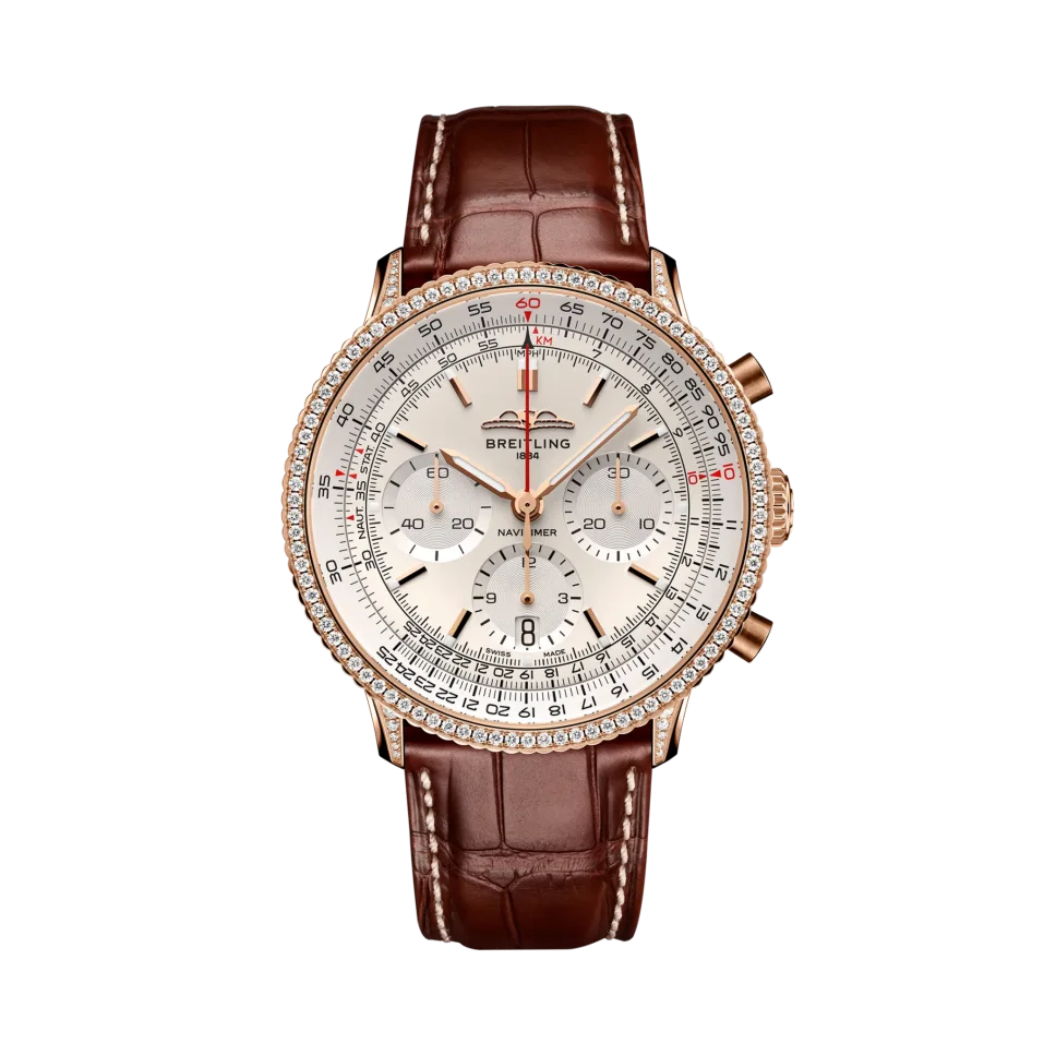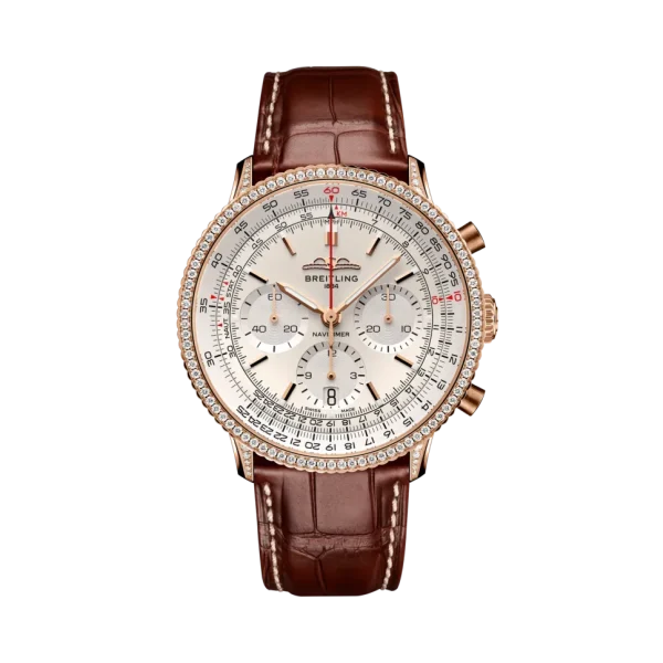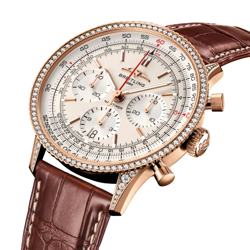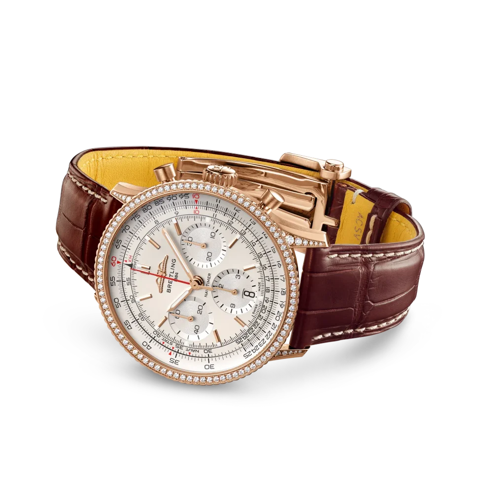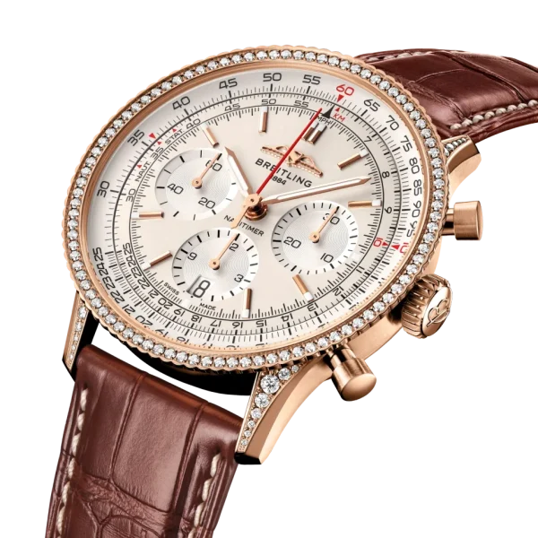 watch Breitling Navitimer B01 Chronograph 41 in Brushed and Polished 18k Red Gold case, Reference RB0139631G1P1. In a world where precision meets elegance, they reign supreme as they are crafted with meticulous attention to detail, embodying the spirit of aviation excellence and exuding timeless sophistication. 18k Red Gold hands with luminescent filling and 18k Red Gold baton indexes with luminous tips harmoniously complement the striking Cream dial. Impressive are the AOPA wings, symbol of the Aircraft Owners and Pilots Association, the largest pilots’ club in the world, which in the 1950s chose the Navitimer as its official watch at 12 o’clock. The technical excellence of this model is achieved through the chronograph, which includes the elegant red central second hand; Cream sub-dial for 30-minute counter at 3 o’clock; Cream 12-hour counter subdial at 6 o’clock. The functionality of the watch is enhanced by the typical circular slide rule on a black background, allowing pilots to perform all necessary flight calculations. The watch also has a Cream second’s sub-dial at 9 o’clock and a date indicator at 6 o’clock. The dial is covered with a domed scratch-resistant sapphire crystal with anti-reflective coating on both sides. The transparent sapphire crystal case back reveals the mesmerizing operation of the movement. The watch features a bi-directional fluted 18k Red Gold bezel with a scalloped profile for easy grip. The bezel and lugs are set with 90 flawless round diamonds, which gives the watch a unique charm. A masterpiece of engineering, Breitling’s in-house Caliber 01 contains 47 jewels and has an approximate power reserve of 70 hours, ensuring exceptional precision, allowing you to conquer every moment with unwavering precision. The watch presented on the original Breitling Brown Alligator leather strap with contrasting off-white stitching which fastens 18k Red Gold Folding Clasp. The water resistance is up to 30m/99ft (3 ATM).