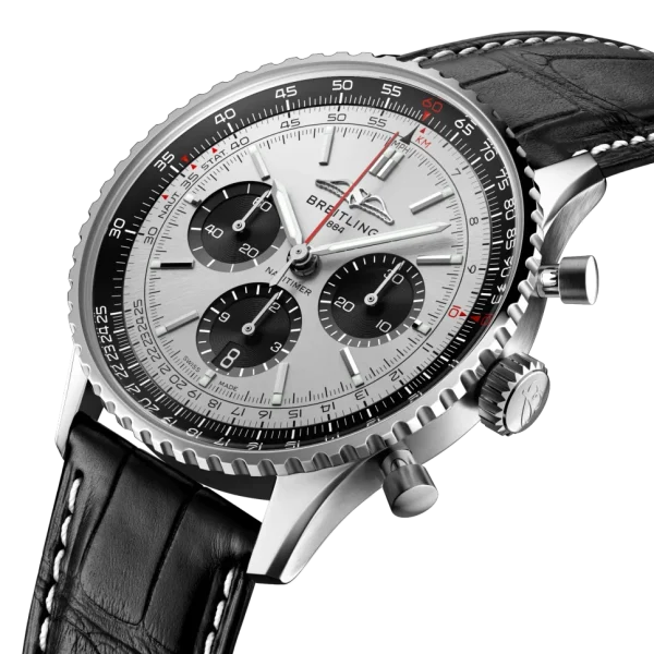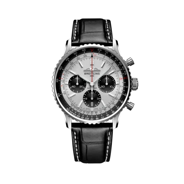 The Breitling Navitimer B01 Chronograph 43 Men’s Watch AB0138241G1P1 offers a 43mm steel case, leather strap, chronograph, date feature, slide rule, automatic chronometer-certified movement, and silver dial with index hour markers. It is a superb choice for those seeking superior workmanship and timeless style.