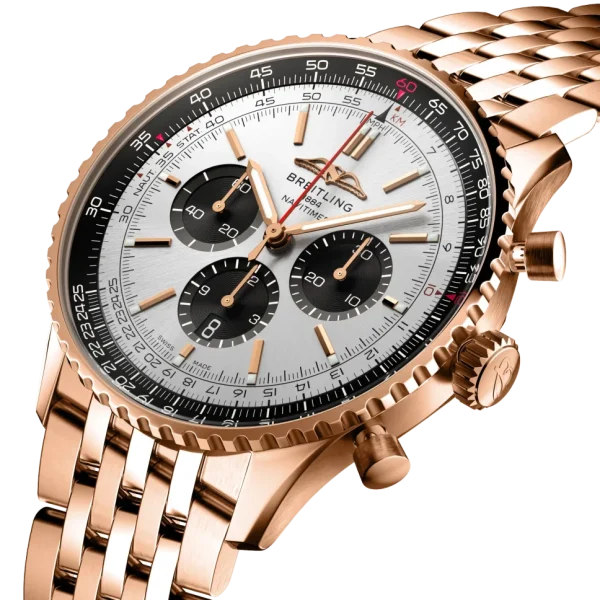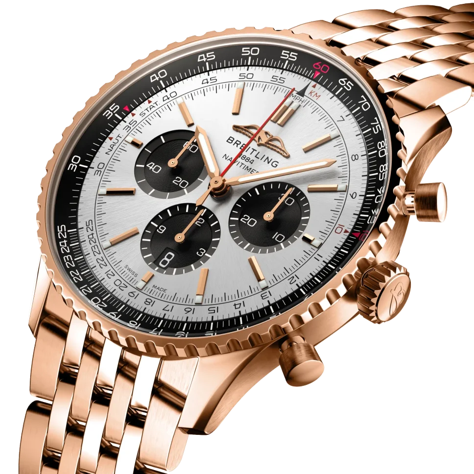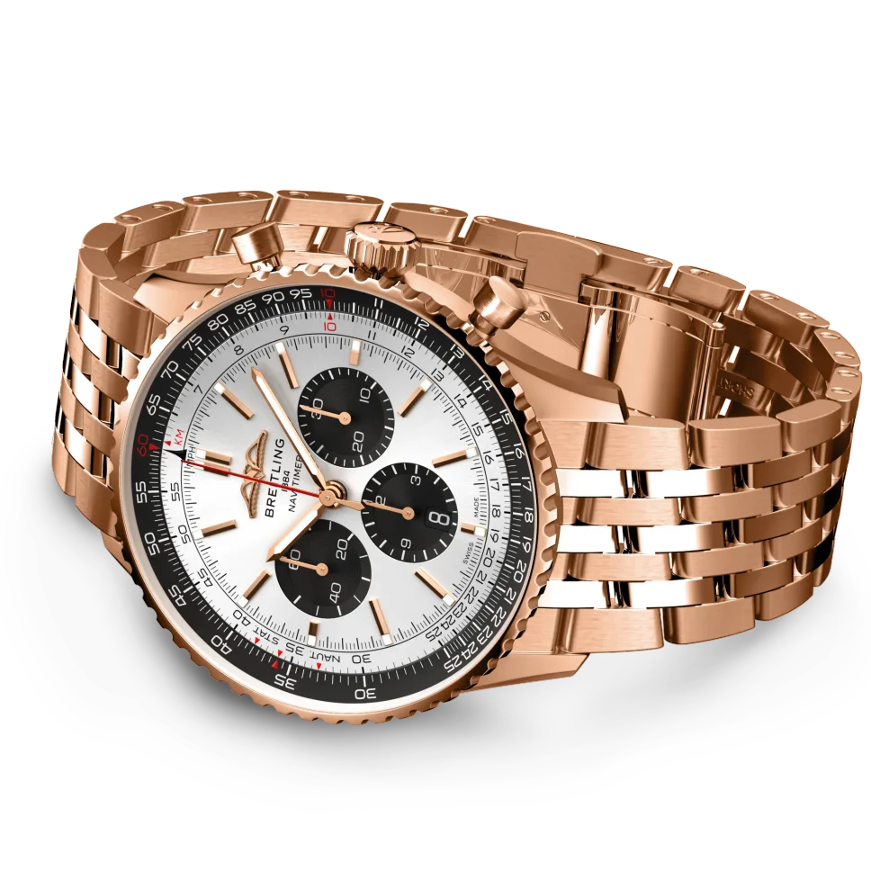 Experience the epitome of luxury and precision with the Breitling Navitimer B01 Chronograph 46 RB0137241G1R1. This exquisite timepiece features a striking silver dial adorned with index hour markers and a useful date display. The chronograph function allows you to measure time with utmost accuracy, while the slide rule adds a touch of functionality to this elegant watch. Encased in a stunning 18k rose gold case, the 46mm watch boasts a bidirectional rotating bezel for added convenience. Fasten it securely to your wrist with the rose gold deployment buckle and enjoy the convenience of the automatic movement and chronometer certification. Elevate your style with this exceptional Breitling timepiece.