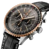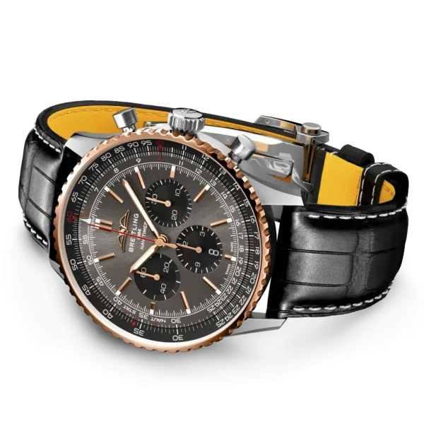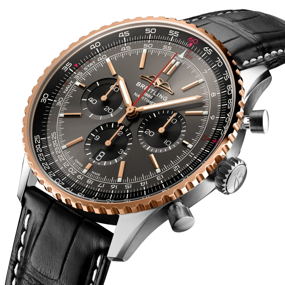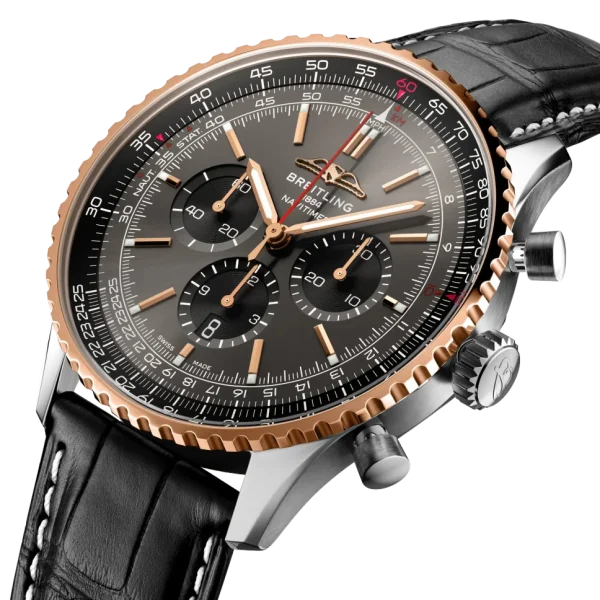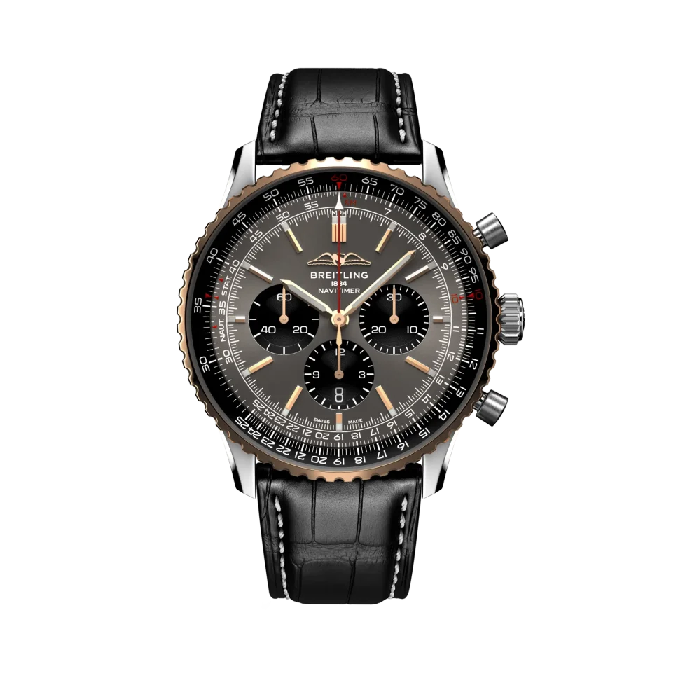 To create the new Navitimer, Breitling preserved the most recognizable aspects of the icon’s design code. From a distance, this new US-exclusive is unmistakably a Navitimer, with its circular slide rule, baton indexes, trio of chronograph counters and notched bezel for easy grip. Up close, however, its modern refinements come through loud and clear. This moody “Blackeye” reference is built around a 46mm stainless steel case which has been topped with an 18k rose gold rotating slide rule bezel. Its moody anthracite dial with contrasting black totalizers is punctuated by matching rose gold hour markers.
