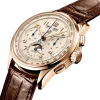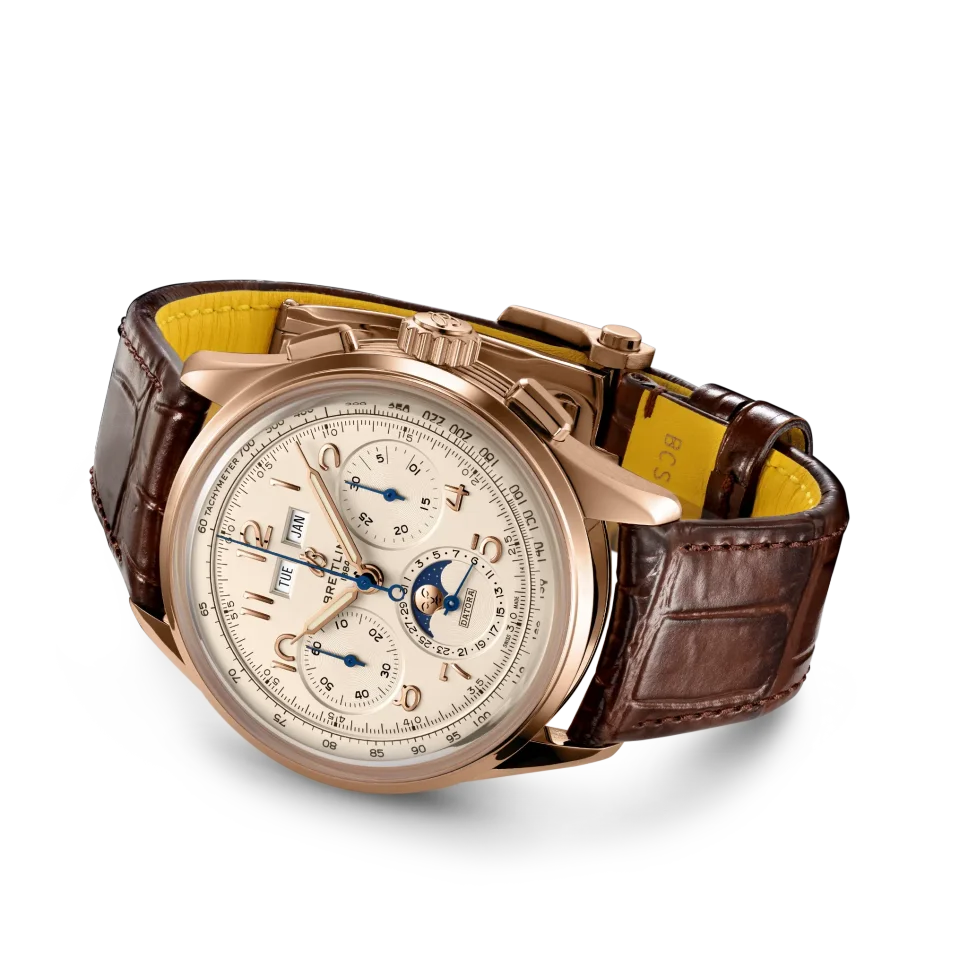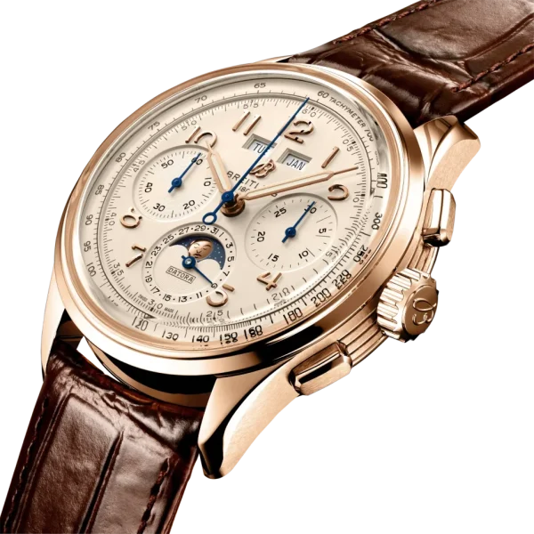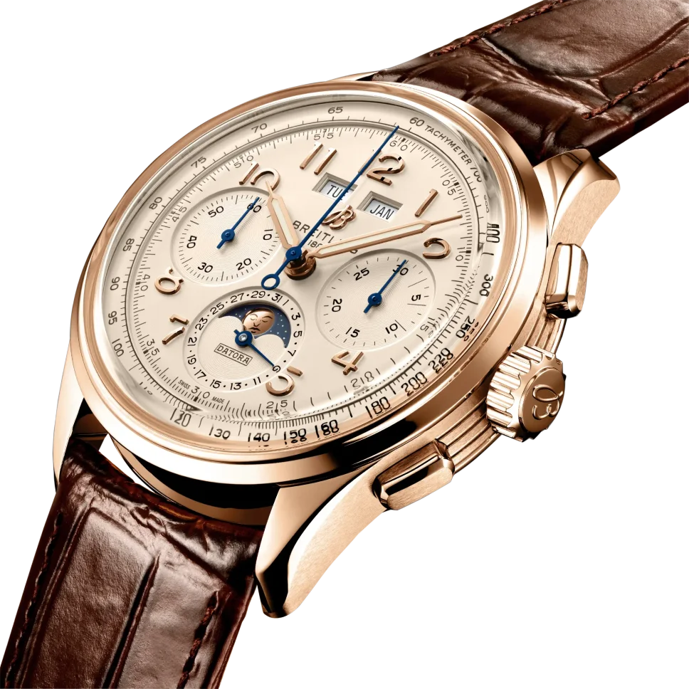 Featuring rectangular chronograph pushers and Arabic numerals, the heritage-revived Premier Datora displays a variety of elegant design details such as grooves on the case-sides, open sapphire casebacks and vintage-inspired hands. The Datora comes in two variations: in stainless steel with a copper dial and a brown alligator strap or in 18k red gold with a silver dial and a brown alligator strap. “Datora” was a term used by Breitling in the 1940s and refers to a complete calendar chronograph displaying day, date, month and the different moon phases. The Datora is powered by the cosc-certified Manufacture Caliber B25.