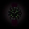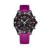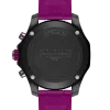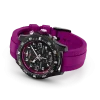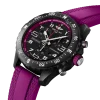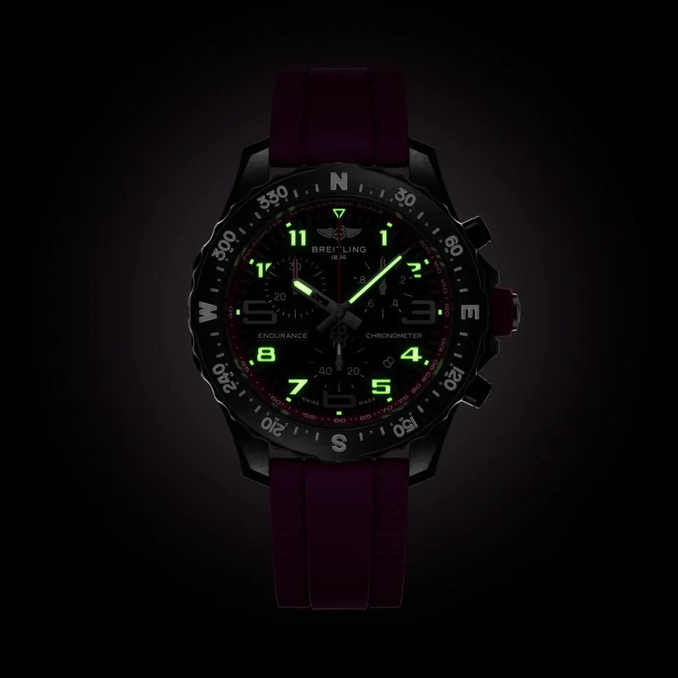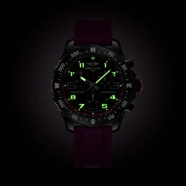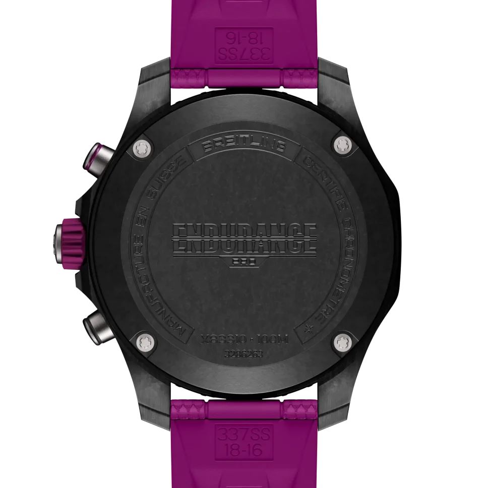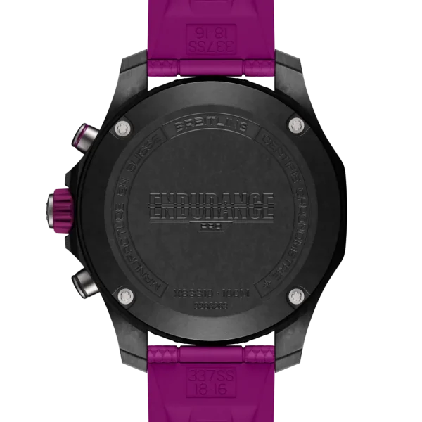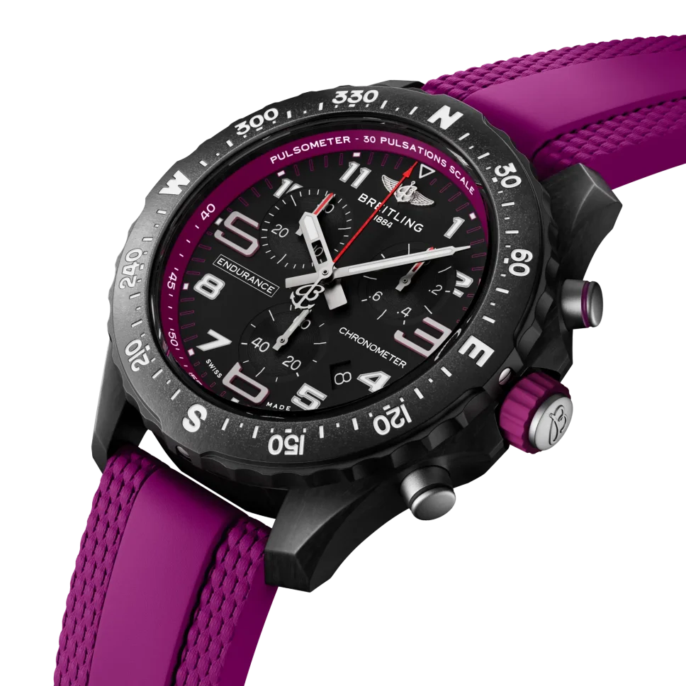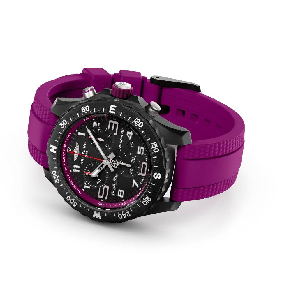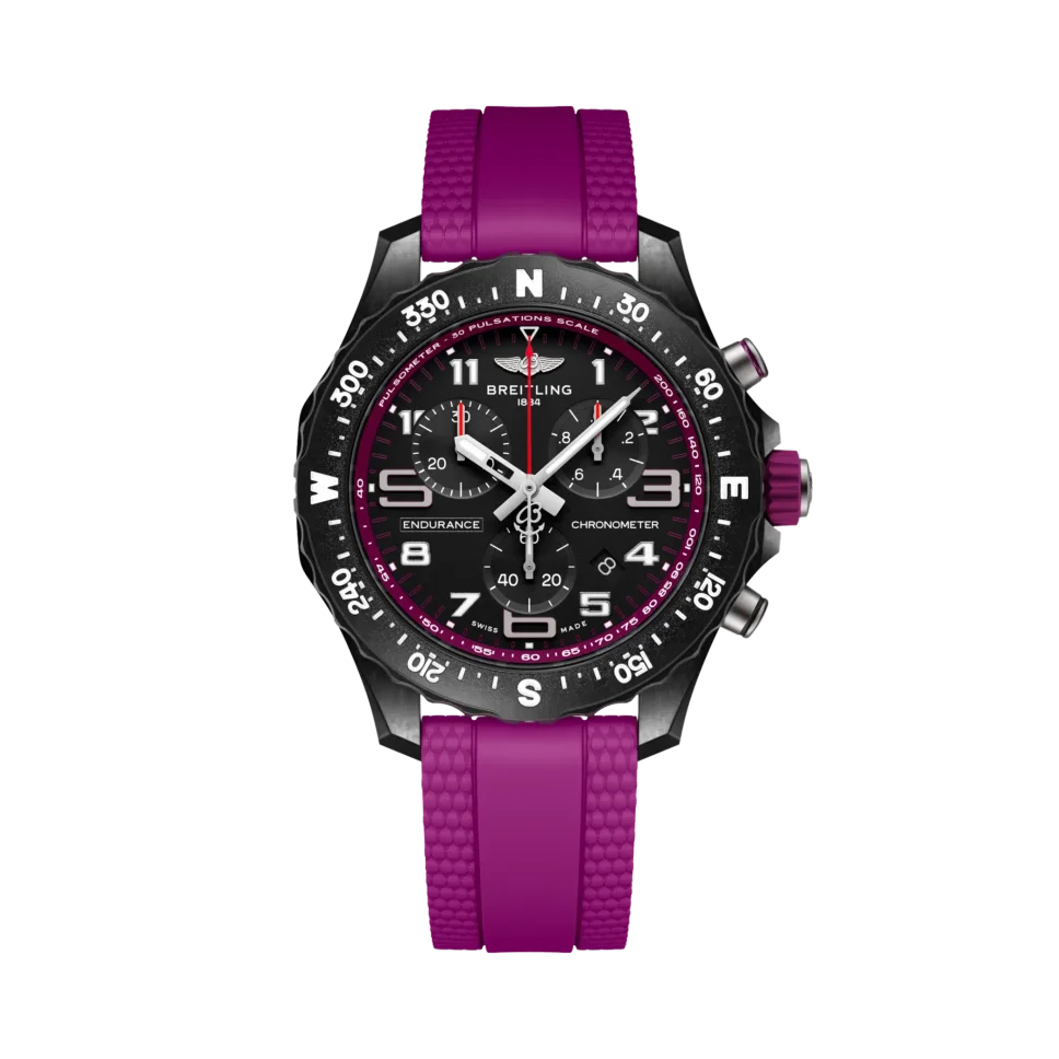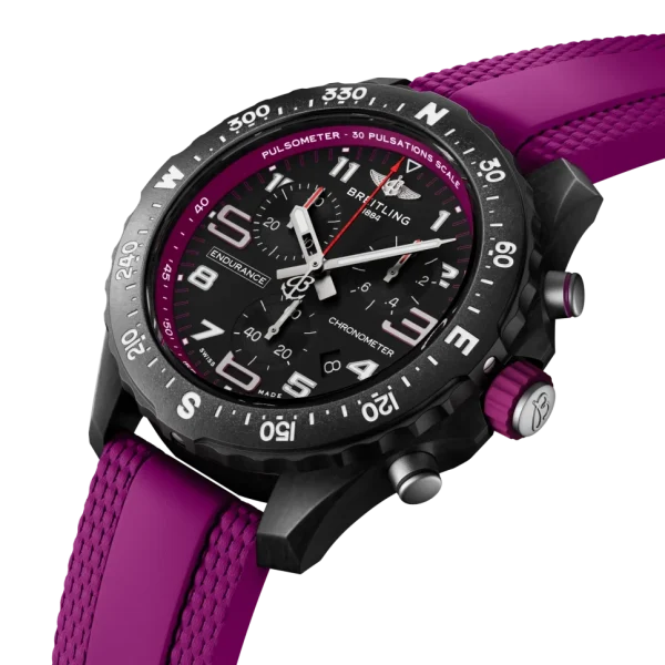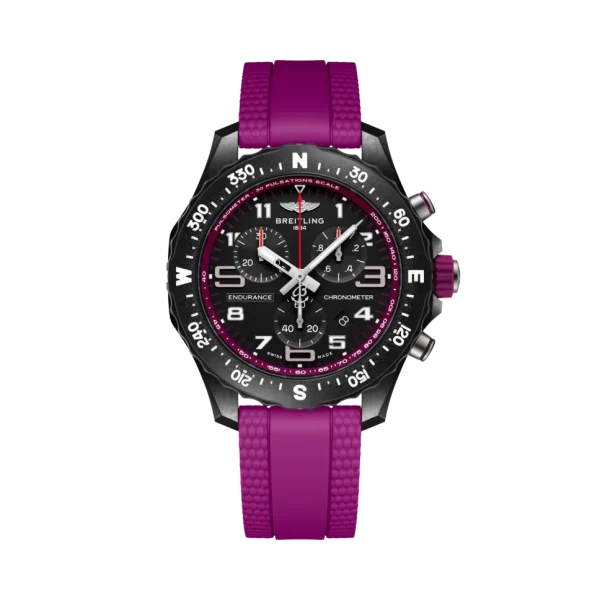 Black breitlight case with a purple rubber strap. Bi-directional rotating black bezel. Black dial with silver-tone hands and index-Arabic numeral hour markers. Minute markers around the outer rim. Dial Type: Analog. Luminescent hands and markers. Date display between 4 and 5 o’clock position. Chronograph – three sub-dials displaying: 60 second, 30 minute and 1/10th of a second. Breitling Calibre 83 quartz movement. Scratch resistant sapphire crystal. Screw down crown. Solid case back. Round case shape, case size: 38 mm, case thickness: 12.1 mm. Band width: 18 mm. Tang clasp. Water resistant at 100 meters / 330 feet. Functions: chronograph, date, hour, minute, second. Endurance Series. Sport watch style. Watch label: Swiss Made. Breitling Endurance Chronograph Quartz Black Dial Unisex Watch X83310F61B1S1.