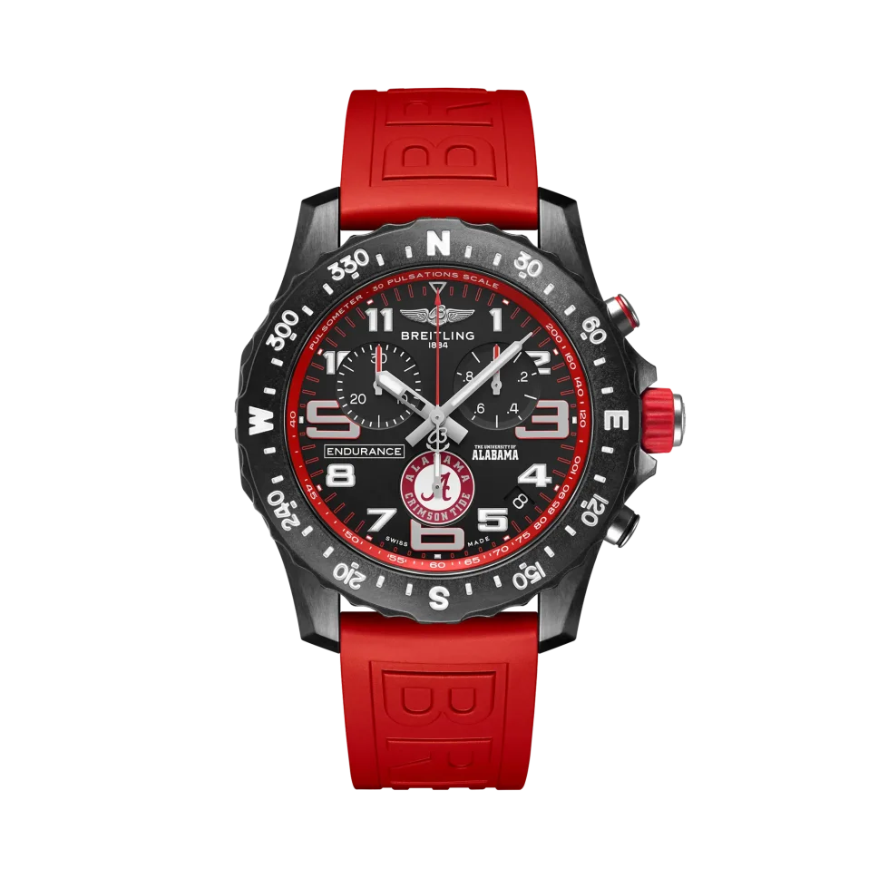 There’s a reason we call our Endurance Pro “the ultimate athleisure watch.” It’s because it can make the rounds from class to work to the gym without missing a beat. (Sound like a soon-to-be grad you know?) Made of Breitlight®, a material three times lighter than titanium, the Endurance Pro The University of Alabama® edition is legendary for its achievements in athletics, much like U of A alum, who’ll recognize the Crimson Tide color scheme and “Where legends are made” caseback engraving. Designed for men and women whose active lives blend a professional mindset with a sporty lifestyle, the Endurance Pro is equal to the challenges of a rigorous workout but fashionable enough for everyday wear.?Non-magnetic, thermally stable and hypoallergenic, Breitlight® is highly resistant to scratches, traction and corrosion. It also has a touch that is warmer than metal and a slightly textured effect accentuating the originality of the design. Exclusive to Breitling, it is 100% Swiss-made. Powering the Endurance Pro is Breitling’s Caliber 82, a COSC-certified SuperQuartz™ chronograph delivering exceptional precision.