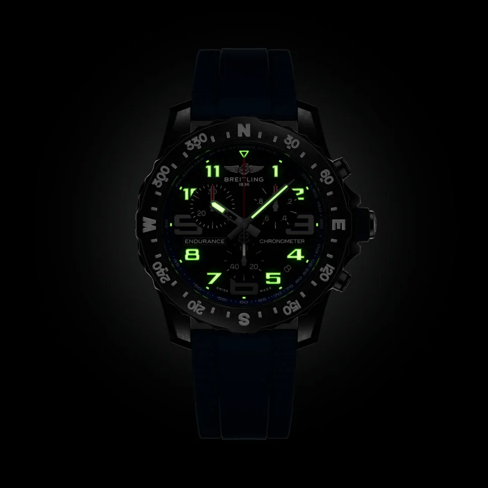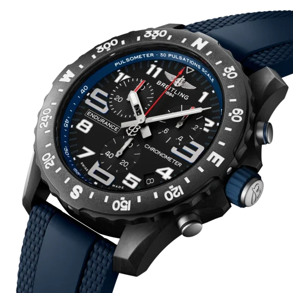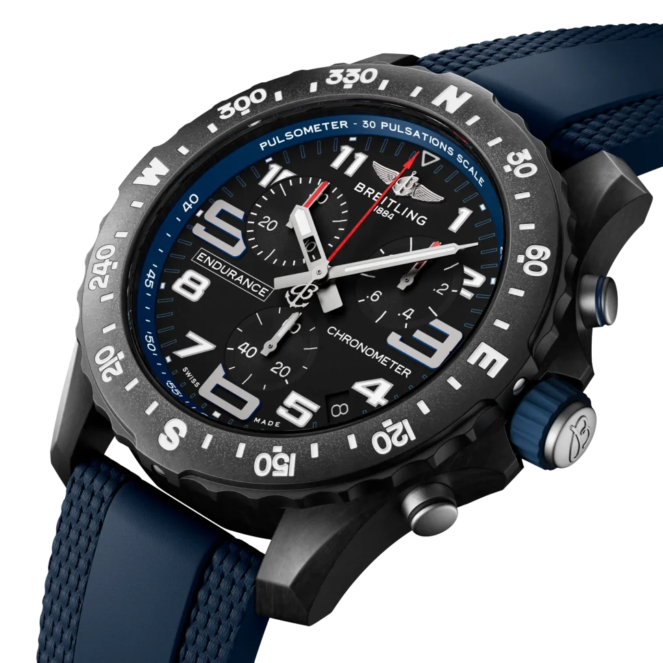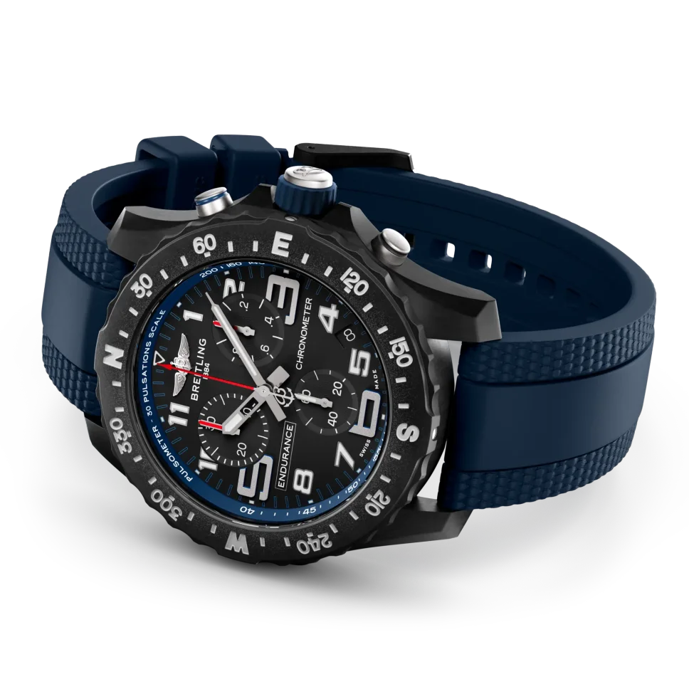 This watch is fitted to a color-matched Breitling rubber strap with a Breitlight® double tang-type buckle. Powering the Endurance Pro is Breitling’s Caliber 82, a COSC-certified SuperQuartz™ chronograph delivering exceptional precision and utility – particularly when combined with the bi-directional rotating bezel and pulsometer functionality demarcations encircling the dial, enabling the wearer to navigate using the sun’s position or measure their own heartbeat.