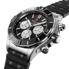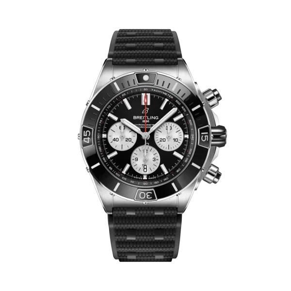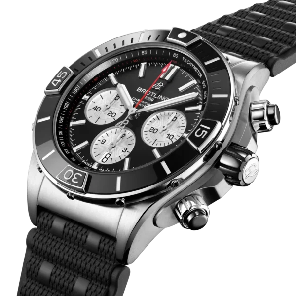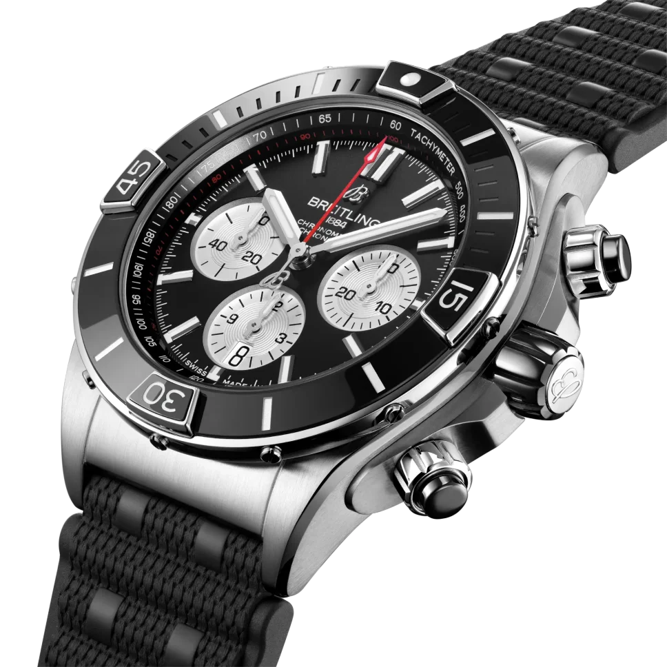 Breitling Super Chronomat B01 Stainless Steel – Black Dial 43 mm Stainless Steel case. Unidirectional ratcheted rotating bezel. Sapphire, glareproofed both sides crystal. Breitling 01 calibre, self-winding mechanical movement, 70 hours power reserve, 47 jewels. Rubber strap Folding clasp. Water resistance 200 m (660 ft)