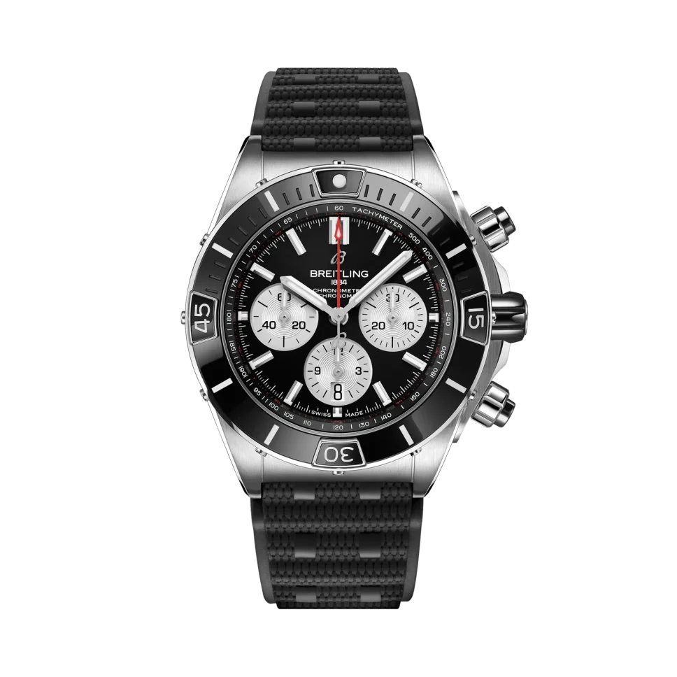SpecificationsMakeBreitlingModelSuper Chronomat B01ReferenceAB0136251B1S1Diameter44 mmCase MaterialStainless SteelDial ColorBlackBezel TypeUnidirectional ratcheted rotating bezelBezel ColorBlackBezel MaterialStainless SteelCrystalSapphire, glareproofed both sidesMovementself-winding mechanicalBracelet TypeStraightBracelet MaterialRubberClaspFolding claspFunctionsDisplay back, Small seconds, Rotating Bezel, Only Original Parts, Luminous indicesWater Resistance200 mWarrantyBalance of 2-Year Breitling International Warranty