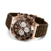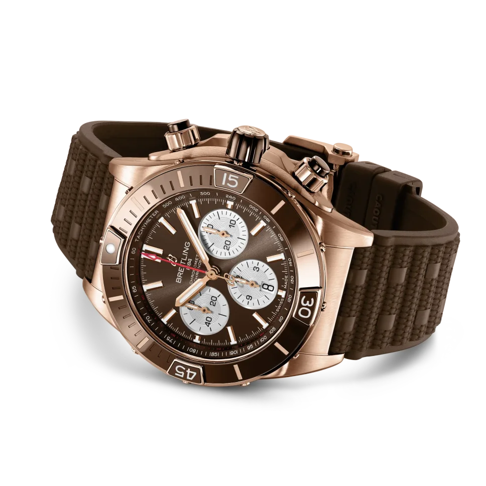 Breitling Super Chronomat B01. Brown dial 44 mm 18k Red Gold case. Unidirectional ratcheted rotating bezel. Cambered sapphire, glareproofed both sides crystal. Breitling 01 calibre, Self-winding mechanical, 70 hours power reserve, 47 jewels. Rubber strap Fold clasp. Water resistance 200 m (660 ft).