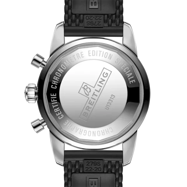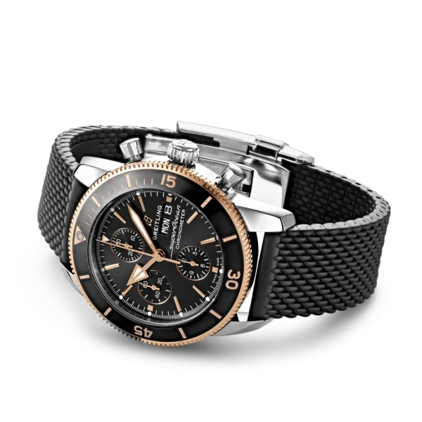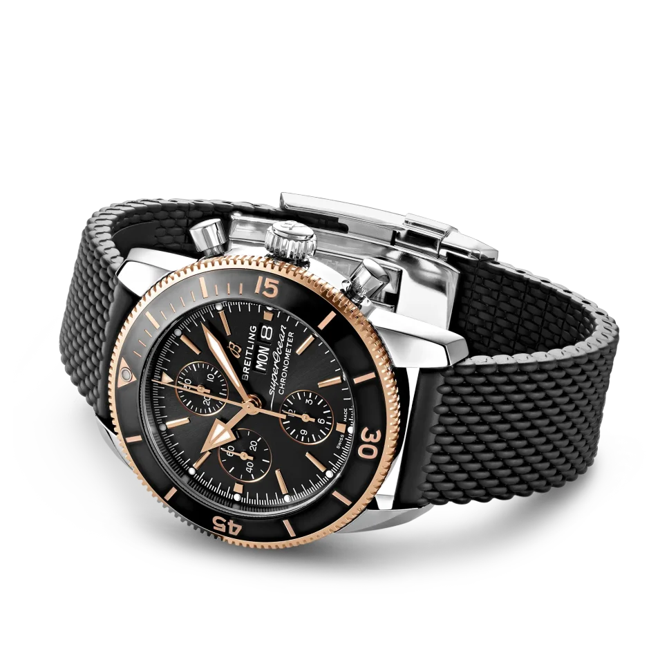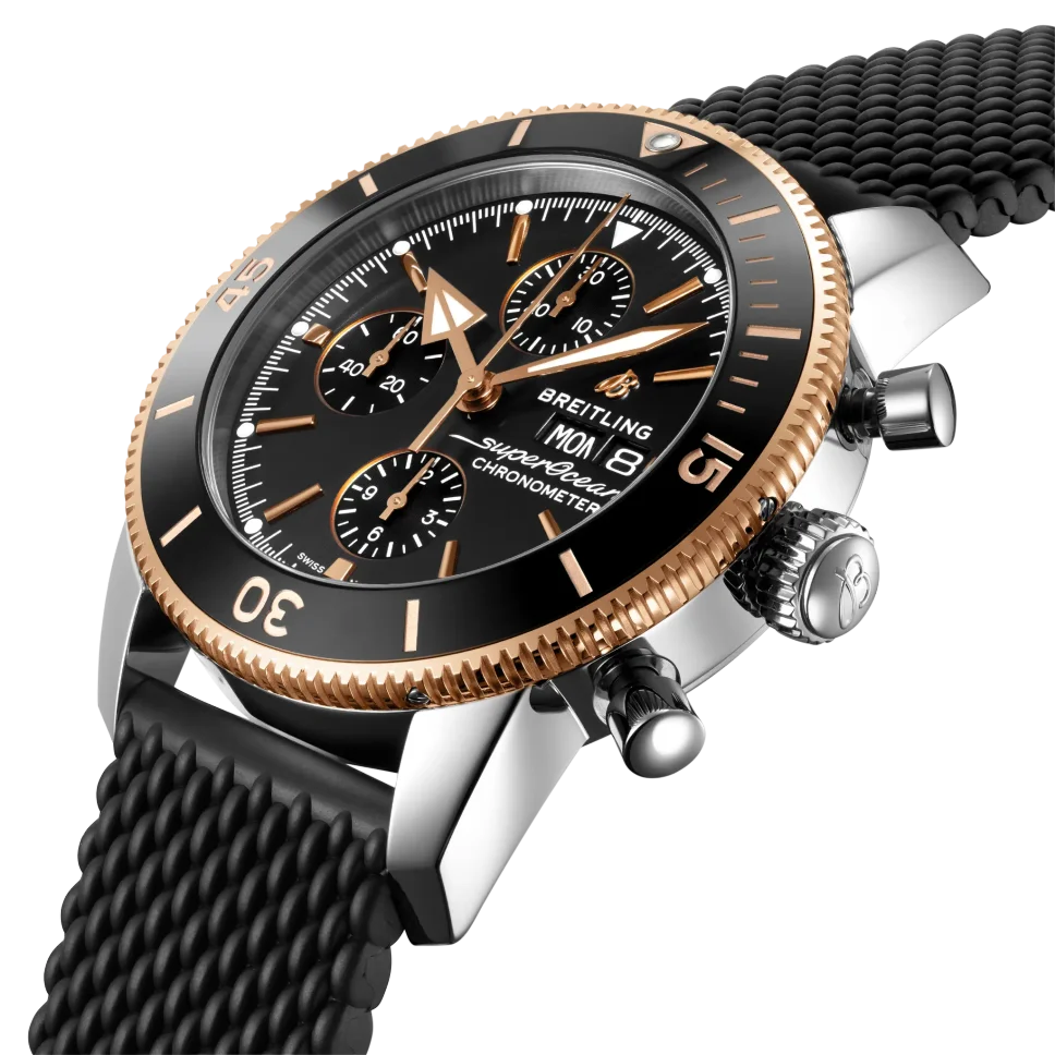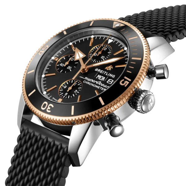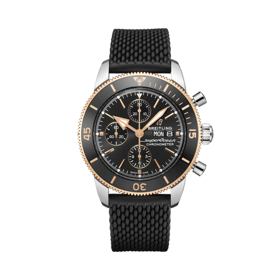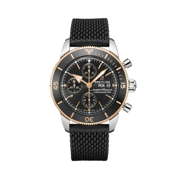 The Breitling Superocean Heritage II Chronograph 44 Men’s Watch U13313121B1S1 is an exceptional timepiece for diving enthusiasts. Crafted with a polished stainless steel case and a black Aero Classic rubber strap, this watch exudes both durability and style. Its polished solid 18k rose gold unidirectional rotating bezel adds a touch of elegance to the design. The black dial is accented with rose gold elements and features luminescent hour and minute hands, as well as dots tipping the index hour markers. At 3 o’clock, you’ll find the day of the week and date displayed in dial apertures, while the chronograph offers a large central seconds hand, a 30-minute counter sub-dial at 12 o’clock, and a 12-hour counter sub-dial at 6 o’clock. For added convenience, there is also a small seconds sub-dial at 9 o’clock.