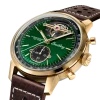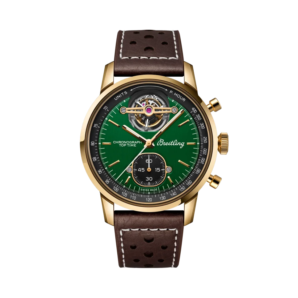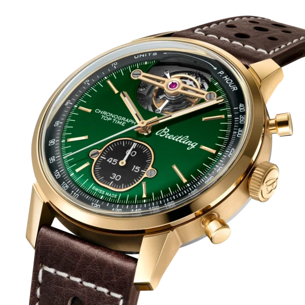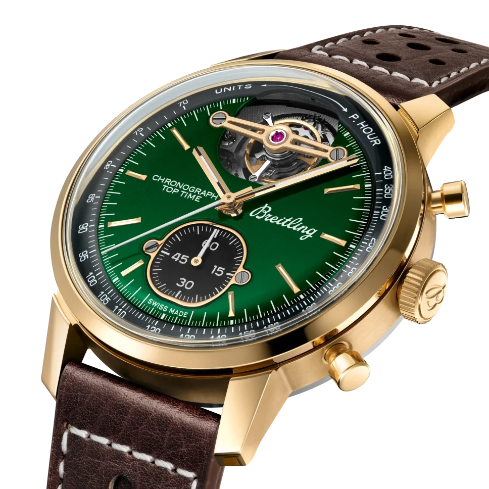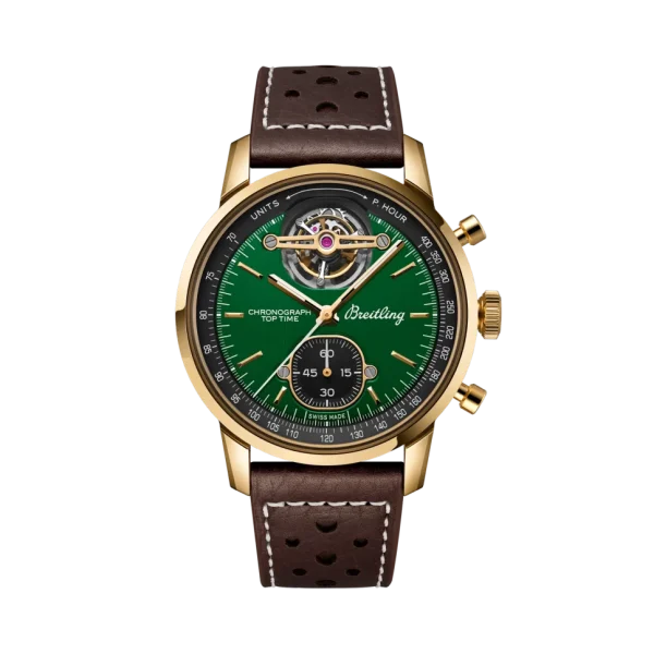This striking model pairs a 44mm bronze case with a perforated, brown leather racing strap.