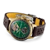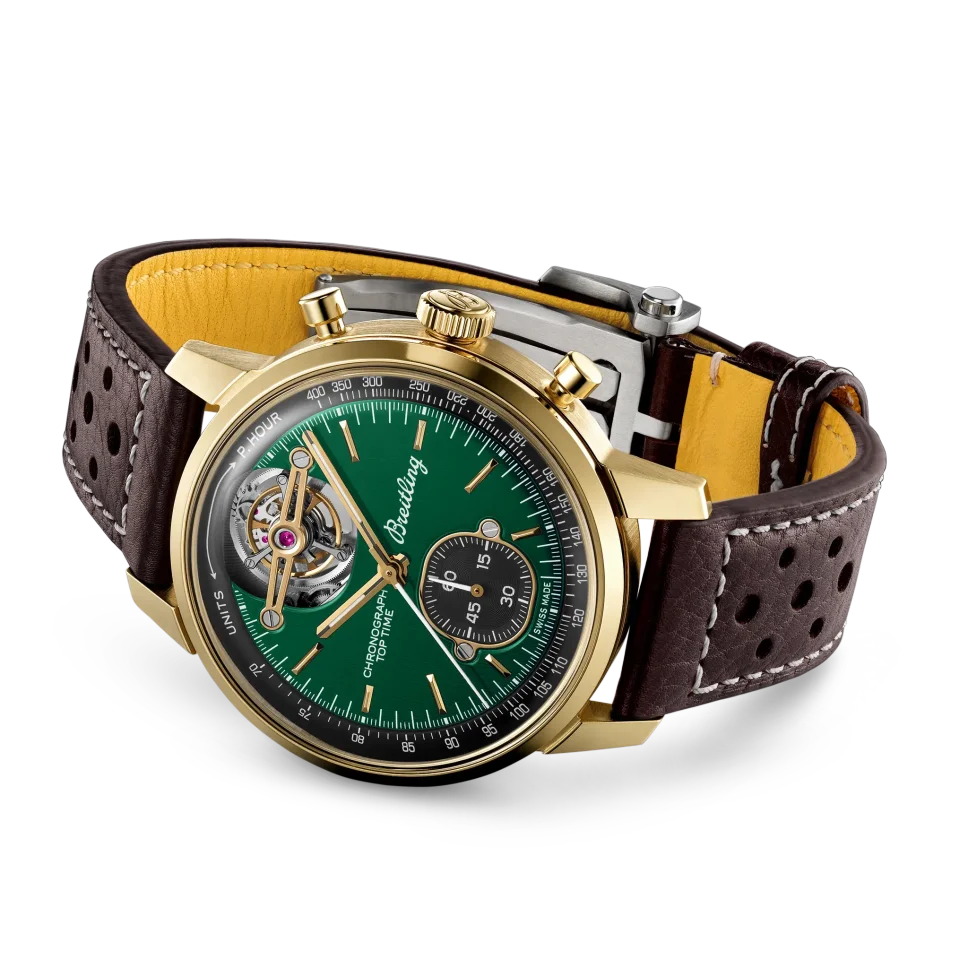 The racing green dial features a tachymeter scale to measure speed, ‘squircle’ sub-dials inspired by the gauges on vintage dashboards, and slender baton hour markers.