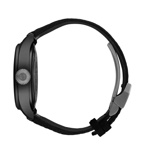 The black dial is equipped with black hands, white detailing, and luminescence for enhanced visibility in all conditions.