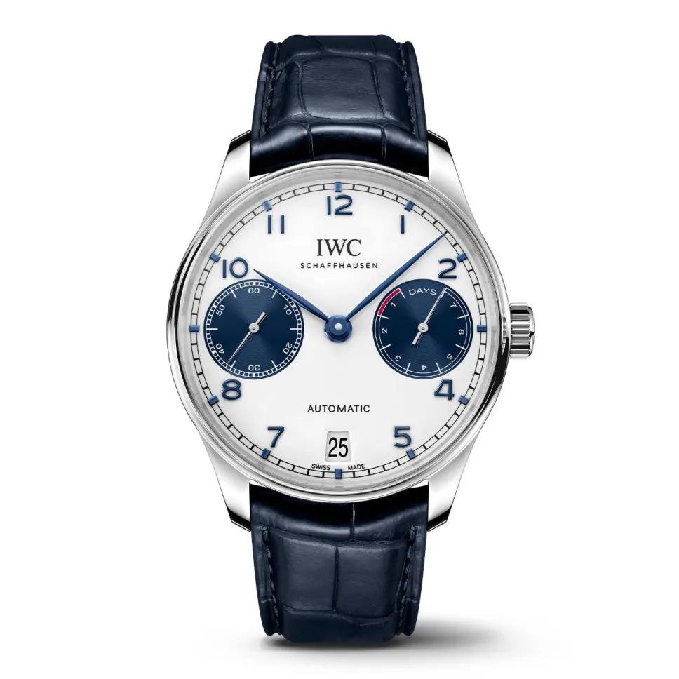 This Big Pilot’s 43mm model combines iconic design with innovative watchmaking technology. Showcasing a blue dial with appliques coated in luminescence, and a black calfskin leather strap with IWC EasX-CHANGE system technology for easy and quick release, this timepiece is always ready for action.