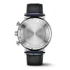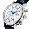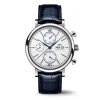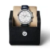 The crisp white dial is home to blue-toned hands and hour markers, as well as a day and date display and chronograph hour, minute, and second function.