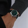 Creating a beautiful contrast, the bold black dial is home to a day and date display, and advanced chronograph functions providing precision to the nearest hour, minute, and second, and a tachymeter scale, all in the iconic Petronas green.