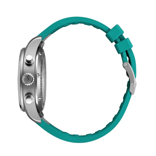 Bold and vibrant, this pilot’s watch is presented in a robust 41mm titanium case, with a Patronas green rubber strap secured with the EasX-CHANGE system.